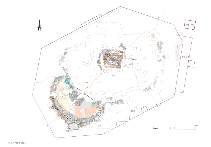 It became clear that Seobongchong was a pair of tombs connected by the oval-shaped northern and southern tombs with diameter measuring 46,7m and 25m, respectively.
