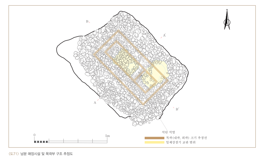 목곽은 완전한 지상식 구조이며, 내곽과 외곽으로 구성된 이중의 목곽이며, 그 안에 목관을 배치했다. 남분은 이중의 목곽 구조이지만 목곽은 북분과 달리 지상식이 아니라 절반 정도가 지하에 있는 구조였다. 북분과 남분의 호석 밖에서 대호를 이용한 제사 흔적이 확인되었다. 대호 내부에서 동물뼈가 다수 확인되었는데, 이것은 무덤 축조 이후 대호에 음식물을 넣어 무덤 주인공에게 바친 제사로 판단된다. 또 남분에서 무덤의 상석이 조사되었는데, 이것은 무덤제사가 정기적으로 실시되었다는 것을 알려주는 증거이다. 지금까지 신라에서 정기적인 무덤제사는 신라 중대(654~780년)부터 시작되었다는 주장이 있었다. 새롭게 찾은 남분의 상석은 그것이 6세기까지 올라갈 수 있는 것을 알려주는 중요한 발견이다.