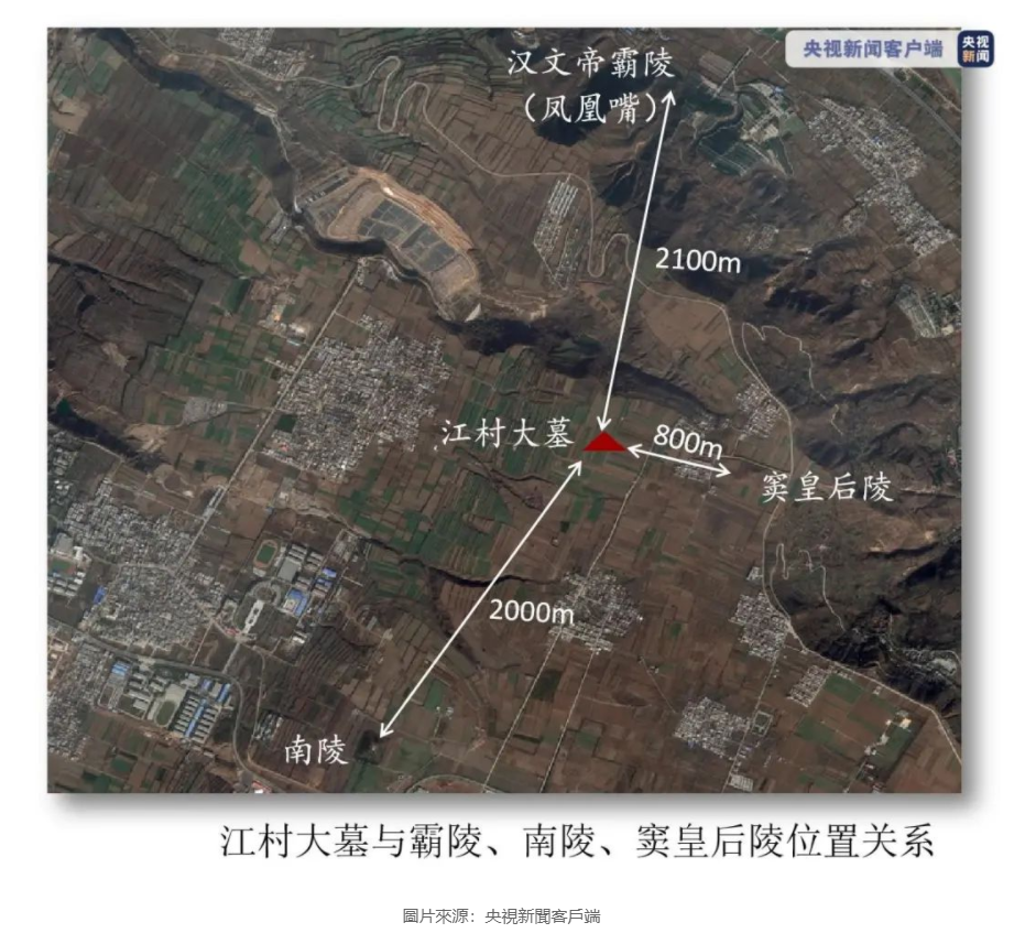 이 강촌대묘 기준 남서쪽 2킬로미터 지점에는 남릉南陵이라 일컫는 서한시대 무덤이 또 하나 있나 보다. 위성지도에서는 확실치 않으나 이것도 볼짝없이 피라미드형이다. 이 남릉을 문제 엄마인 박태후薄太后가 묻힌 곳이라 하는데 그 위치가 다음이라 한다.