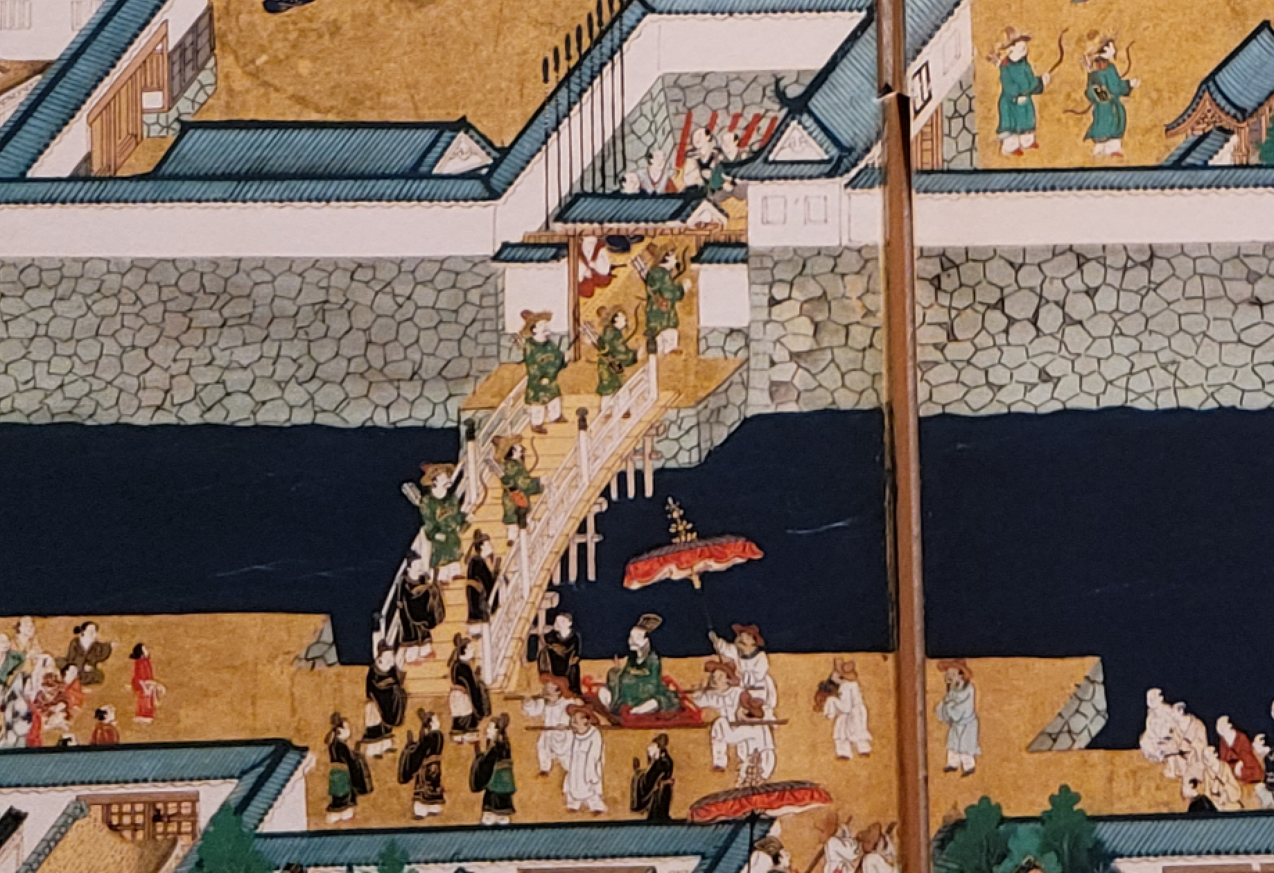 아마도 조선통신사의 모습을 그린것일지? 정사로 보이는 사람의 옷이 조금 이상하긴 한데 주위를 호위하는 무사들의 복장을 보면 조선사람이 맞는 것 아닌가 싶다. 아래 그림 참조.