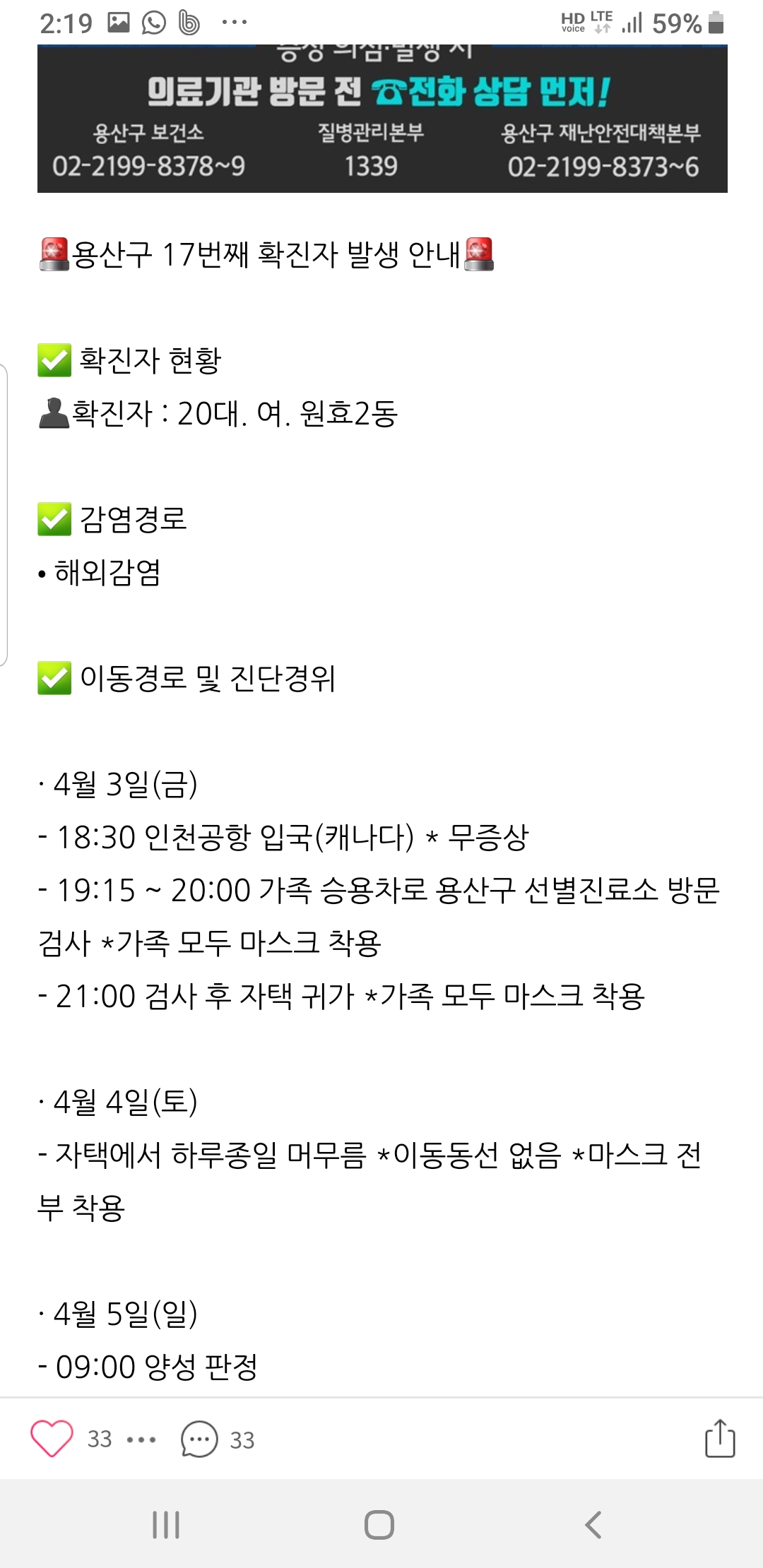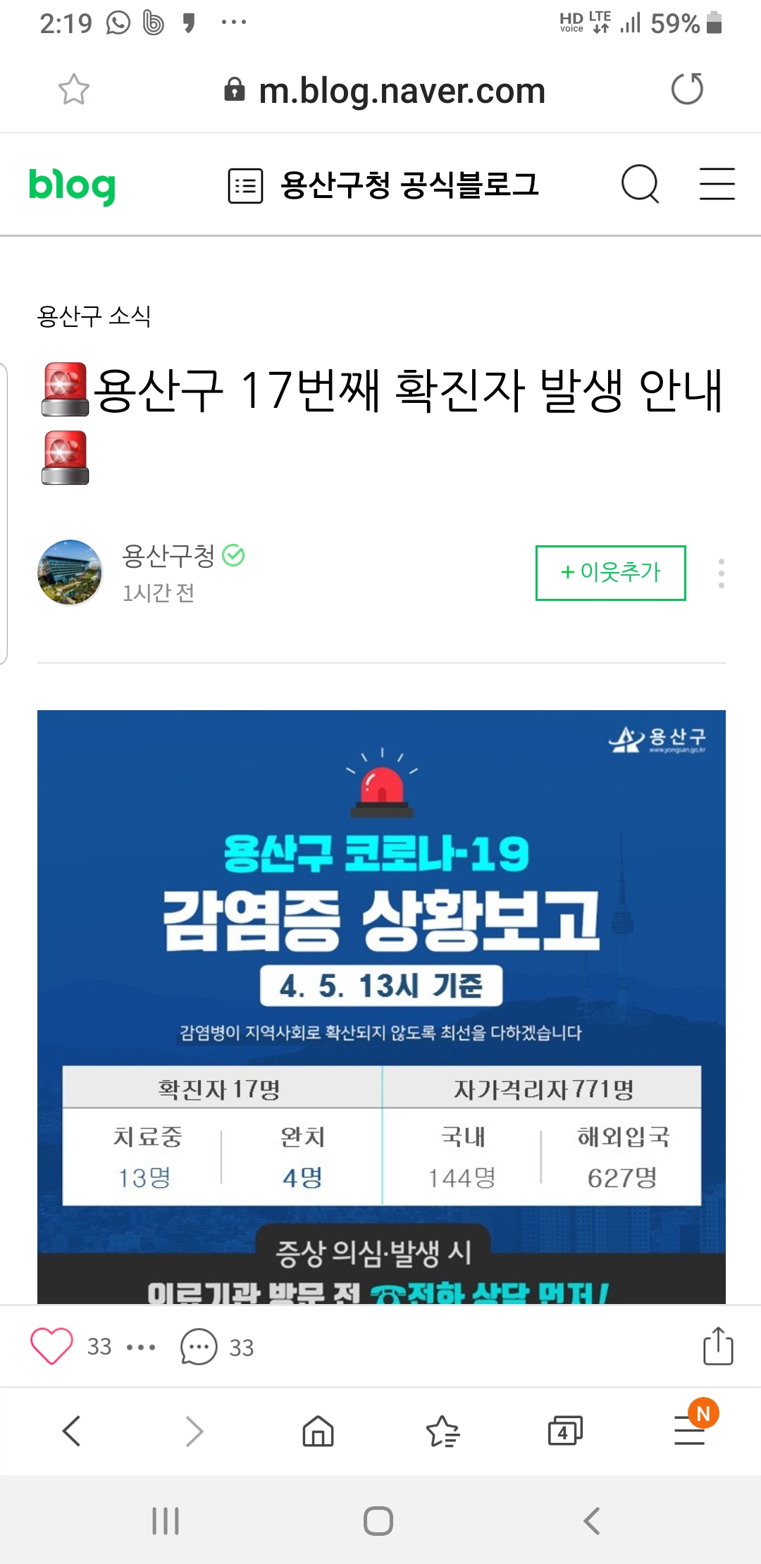 방긍 용산구청에서 날아든 구내 확진자 발생 보고.
