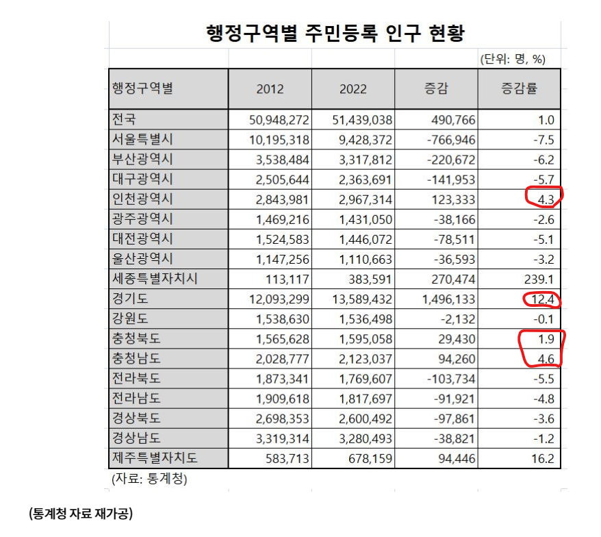 세종시야 워낙 특수한 경우이니 논외로 친다. 저 표를 보면 인구 증가율이 가장 큰 곳은 제주도라, 이 역시 특수상황임을 감안해야 하거니와 그 뒤를 바로 경기도와 인천이 따른다는 사실을 우리는 어찌 봐야 하는가?