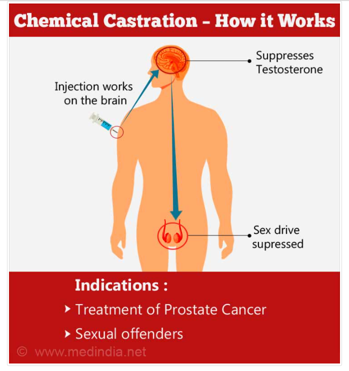 화학적 거세는 약물을 투여해 남성 호르몬 분비를 막아 수술로 고환을 절제한 것과 같은 상태를 만드는 조치다.