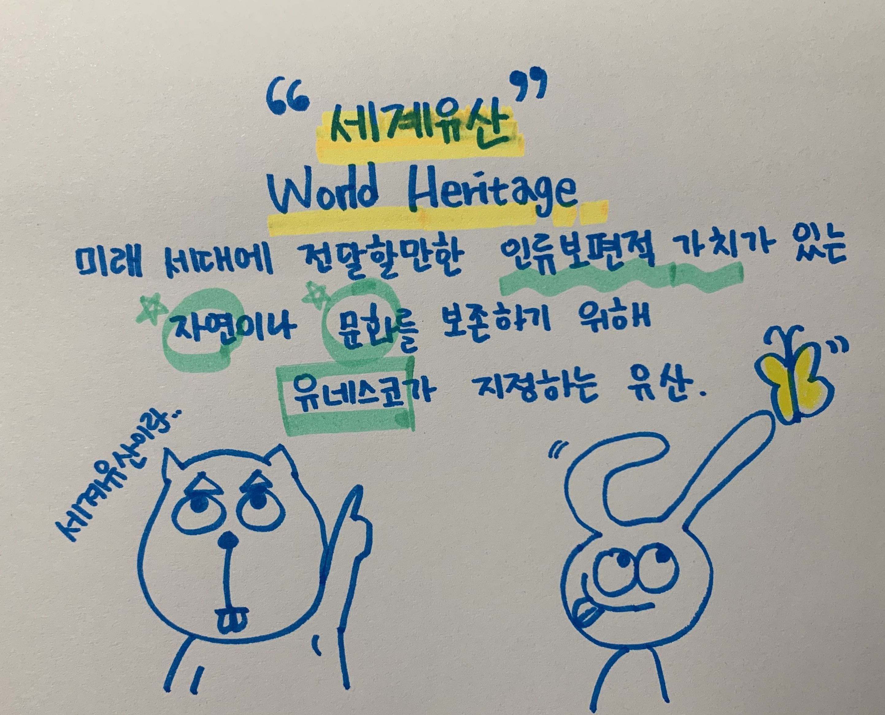 우리가 말하는 세계유산으로 흔히 다음 세 가지를 혼용해서 마구잡이로 씁니다. 1. 세계유산 world heritage 2. 인류무형문화유산 Intangible Cultural Heritage of Humanity 3. 세계기록유산 memory of the world..