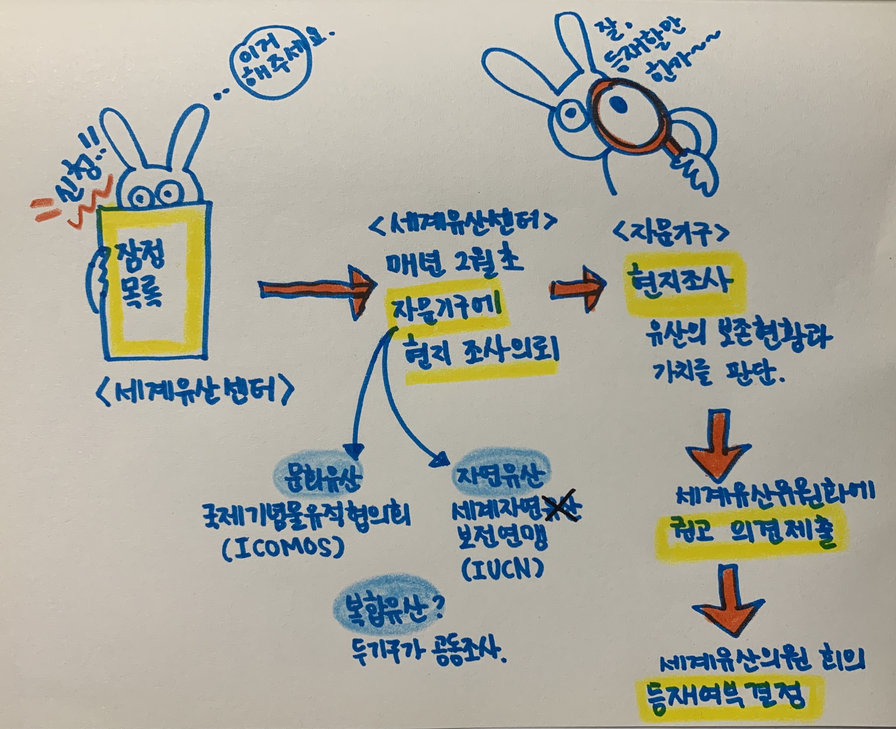 잠정목록(1년 이 지나야 세계유산 등재신청서 제출 자격 획득), 등재신청(자문기구 평가: 데스크리뷰+현지실사+패널미팅->심사결과 WHC 권고 사항으로 제출), 세계유산위원회 등재심의, 결정 된다고 합니다.