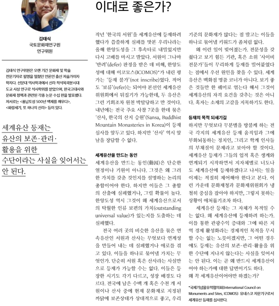 '세계유산 정책 이대로 좋은가' 시론이 유네스코 한국위원회 소식지 올해 6월호에 실렸다.
