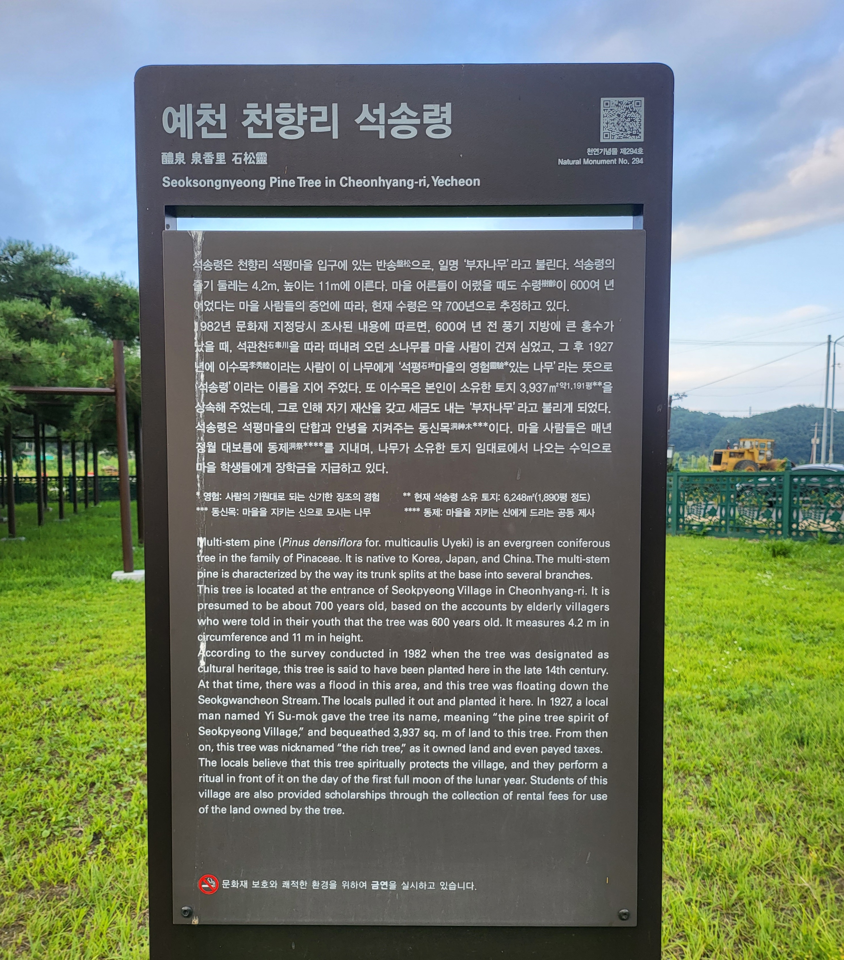 In 1927, a local man named Yi Su-mok gave the tree its name, meaning "the pine tree spirit of Seokpyeong Village" and bequeathed 3,937 sq. m of land to this tree.