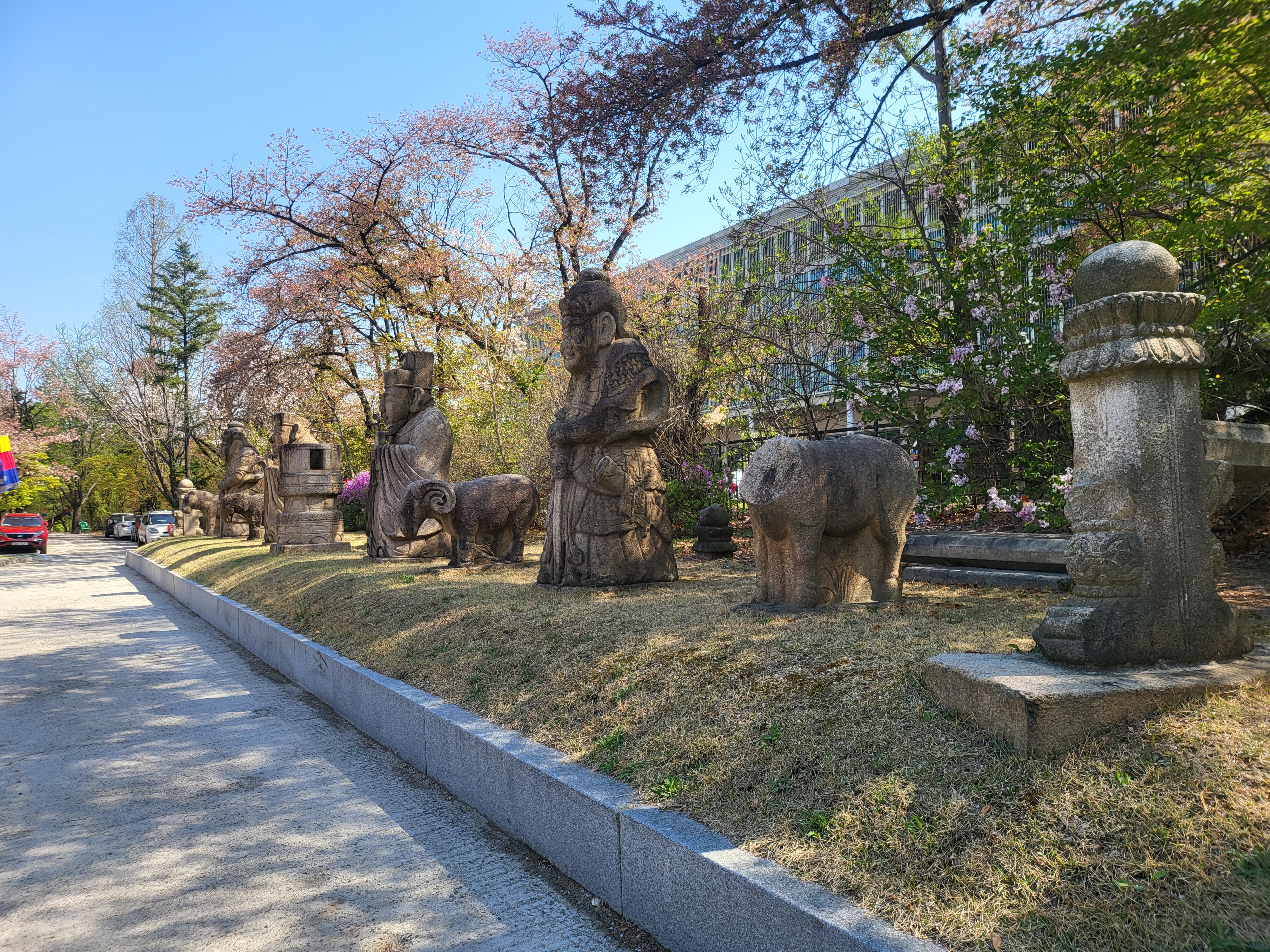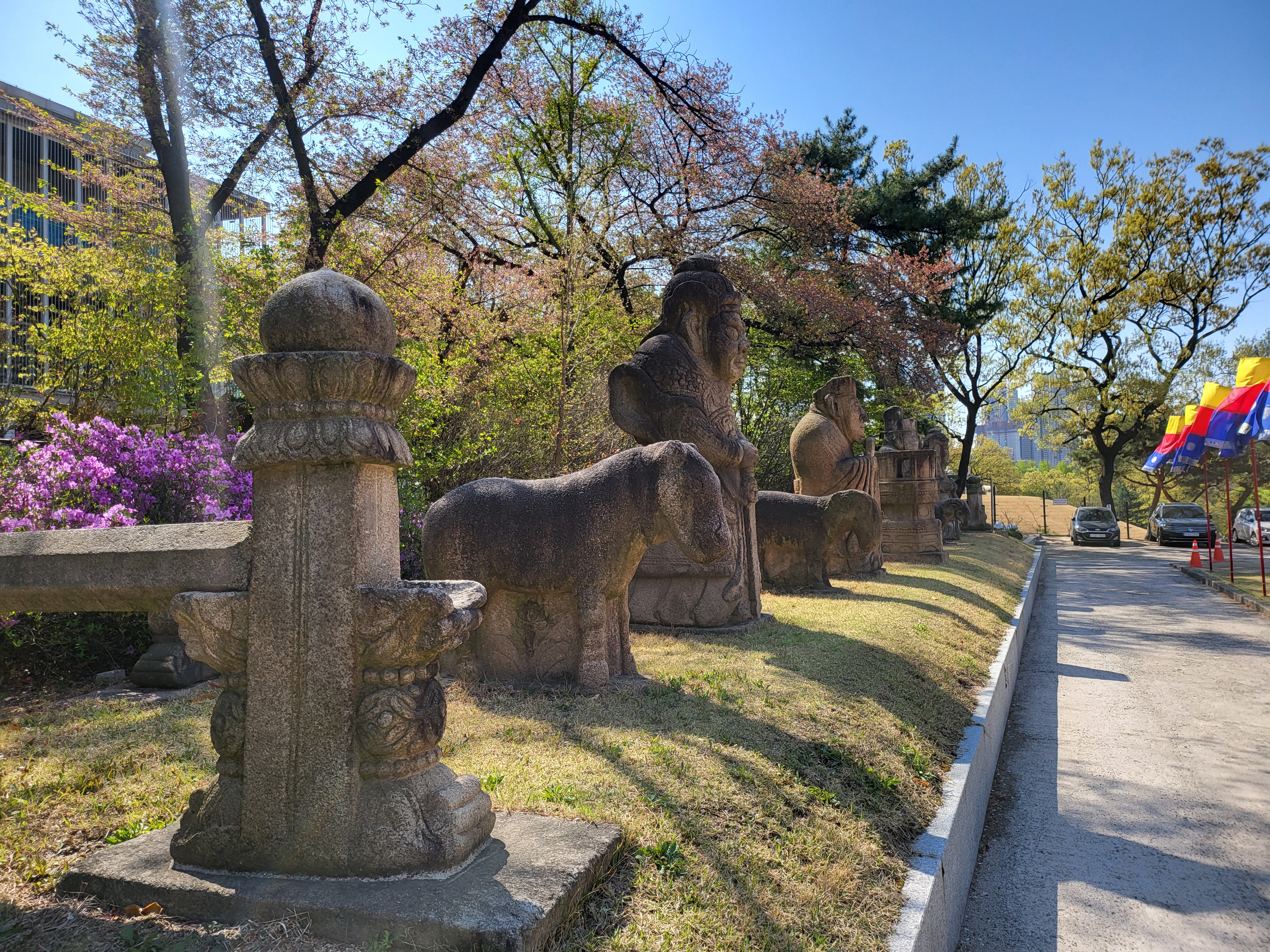 Among them, seokyang (stone sheep), seokma (stone horses), mangjuseok (tomb-side columns), jangmyeongdeung (stone lanterns), seokinsang (stone humans), honyuseok (stone mound), and the stele for King Sejong only remain today and were moved to their current location in 1974.