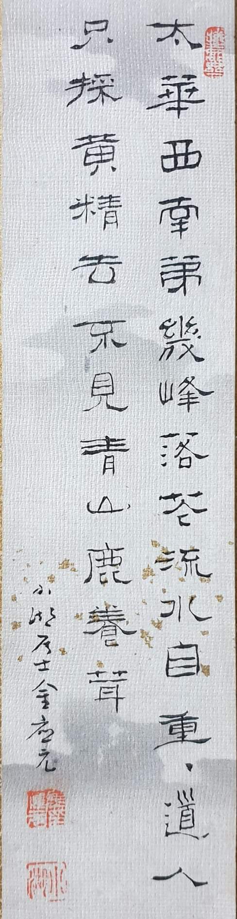 1. 해강 김규진이 빗자루가 아닌 대붓으로 몇 미터가 넘게 '휘호'한 것과는 정반대의 '휘호'를 만난다. 이 글씨는 해강과 같은 시대를 살았던 소호小湖 김응원金應元(1855~1921)이 가로가 5cm 남짓 되는 종이 위에 쓴 것이다. 이런 종이는 단책短冊이라 해서 일본인들이 단카短歌나 하이쿠俳句 같은 자기네 시를 적기 위해 따로 만든 것이다. 먹을 엷게 우려 구름을 피우고 금박을 좀 뿌려 그럴듯한 분위기를 자아낸다. 거기에 소호는 소동파 칠언절구 한 수를 예서로 정밀하게 적어넣는다.
