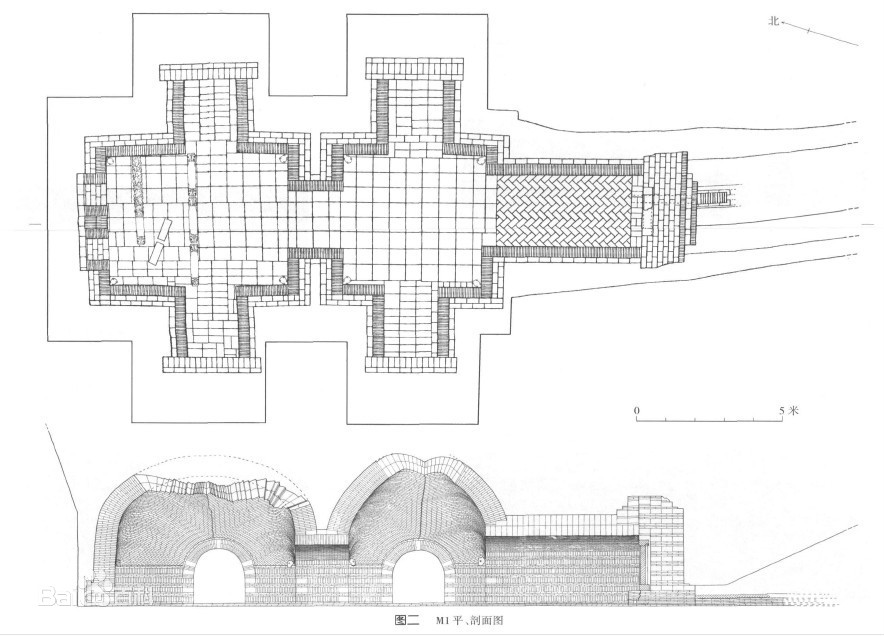 전실砖室은 길이 20.16미터에 宽 10.71미터로서 湖北 鄂州 孙将军墓(长 9.03米)、孙邻墓(长 14.5米)、朱然墓(长 8.7米)、马鞍山 宋山大墓(17.68米)보다 크고 출토 瓷器는 100余件이다.