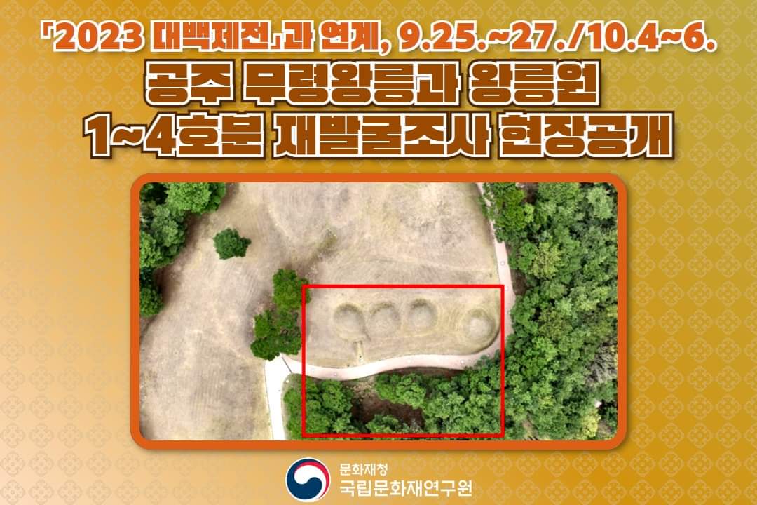 문화재청 국립문화재연구원 국립부여문화재연구소는 9월 25일(월) ~ 27일(수), 10월 4일(수) ~ 6일(금)까지 총 6일간 공주 무령왕릉과 왕릉원 1~4호분 재발굴조사 현장을 「2023 대백제전」과 연계하여 공개합니다.