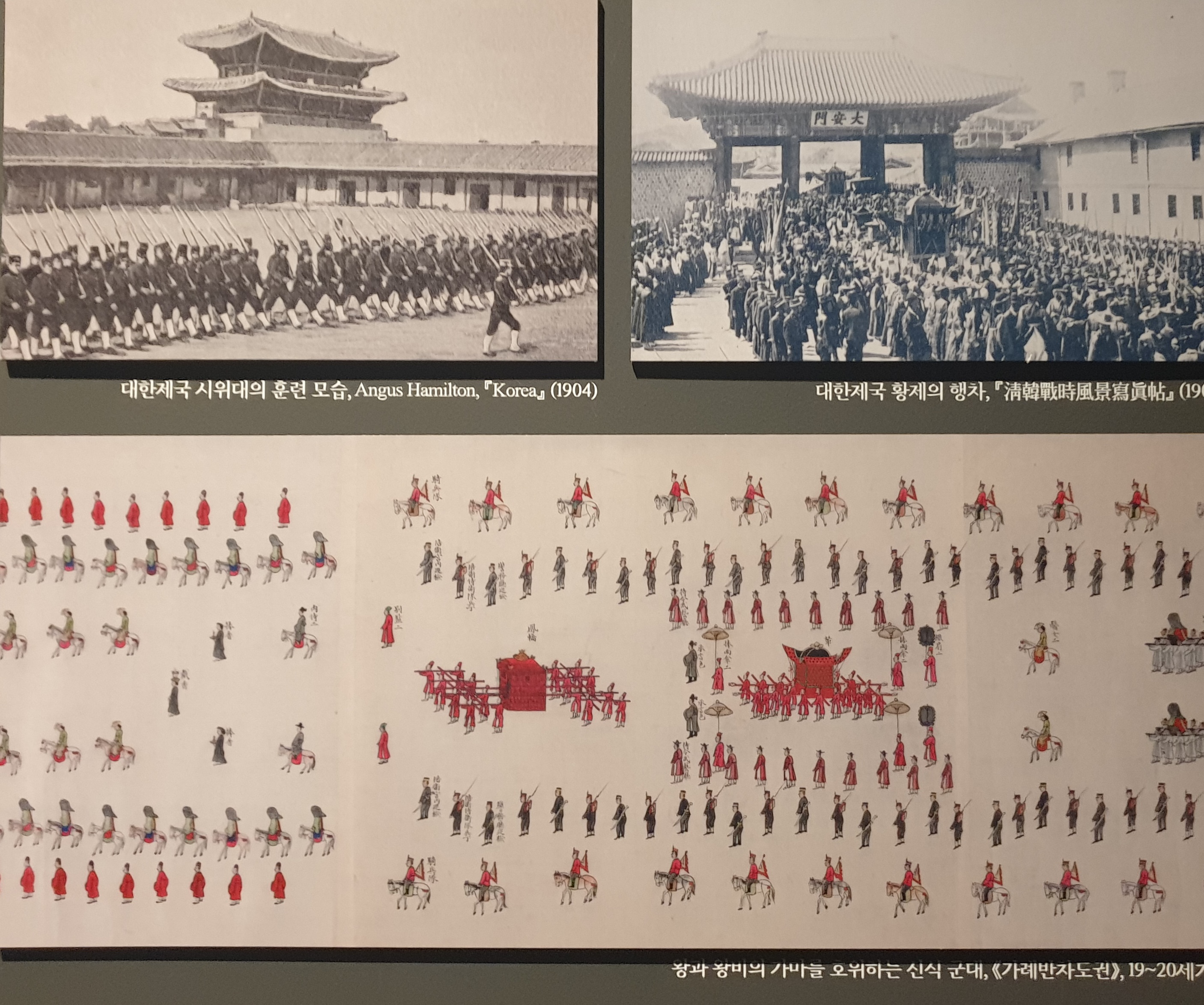 아래는 대한제국 시대 황제를 보위하는 시위대랑, 실제 군주가 궁을 벗어나 행차하는 장면이다.