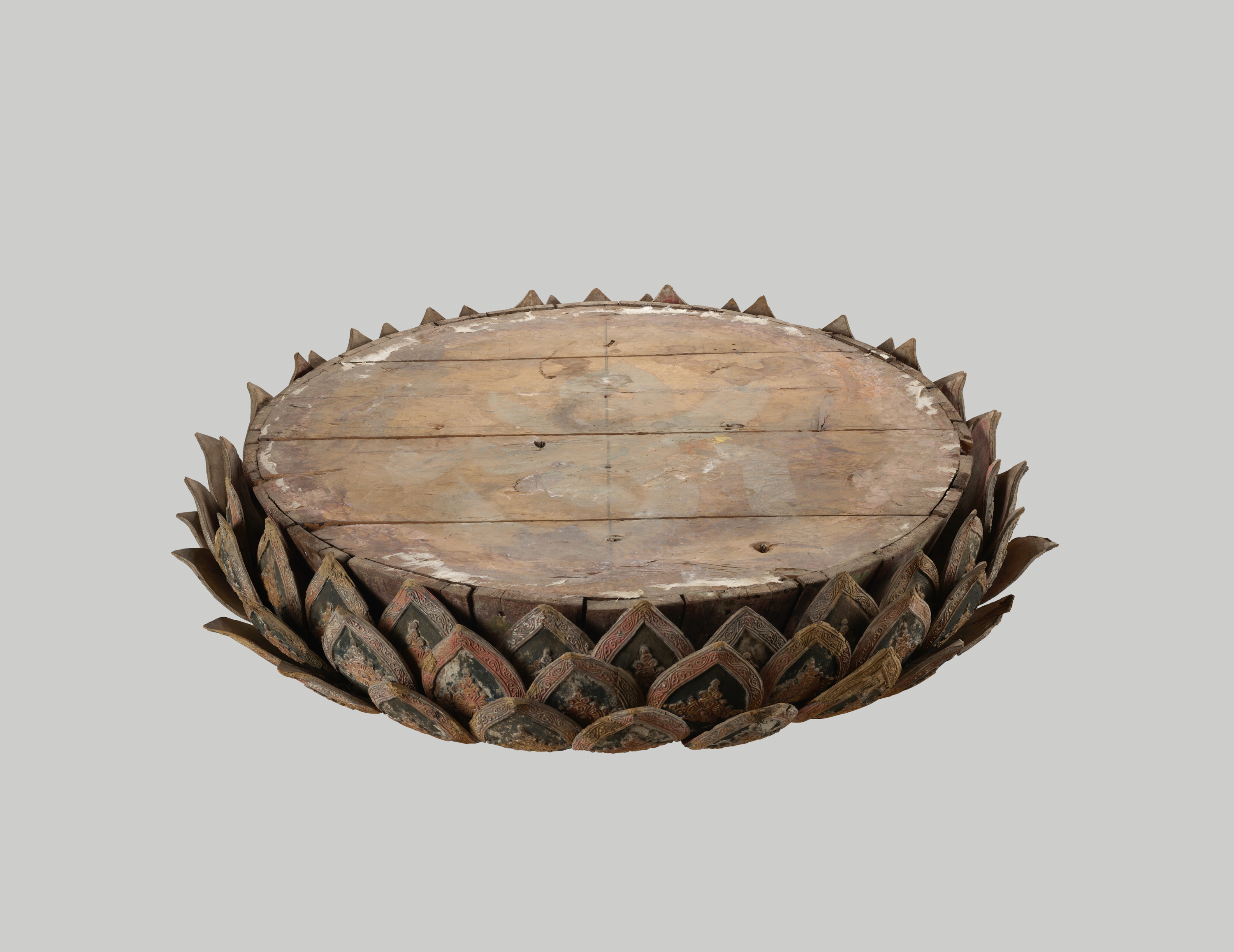 The circular throne was formed by joining rectangular wood panels and decorated with three tiers of lotus petals, separately carved and attached along the side. Each lotus petal, with bead design at the center, is trimmed with a scroll band along the edge. Traces of gilding remain on the relief ornaments.