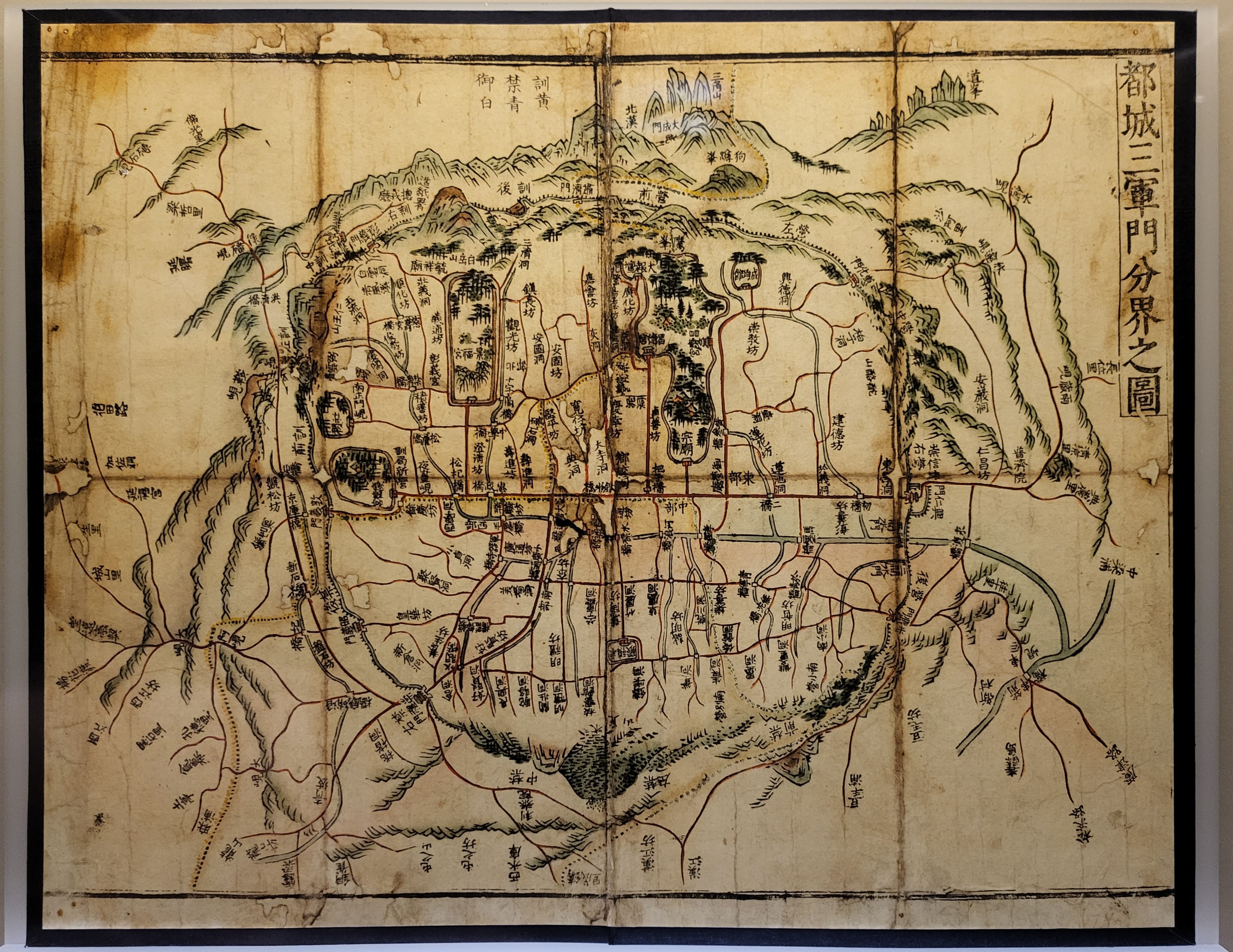 도성삼군문분계지도都城三軍門分界之圖 Map of Three Milltary Forces Control Boundaries in Seoul 서울대학교 규장각한국학연구원.복제 1751년 삼군문三軍門(훈련도감, 어영청, 금위영)의 수도 방위 범위를 표시한 지도 도성 수비를 위해 영조가 반포한 어제수성윤음御製守城綸音 지도다. 조선시대 수도 방위를 담당한 삼군문三軍門인 훈련도감訓鍊都監 어영청御營廳 금위영禁衛營이 각각 맡은 경비 구역이 표시되어 있다.