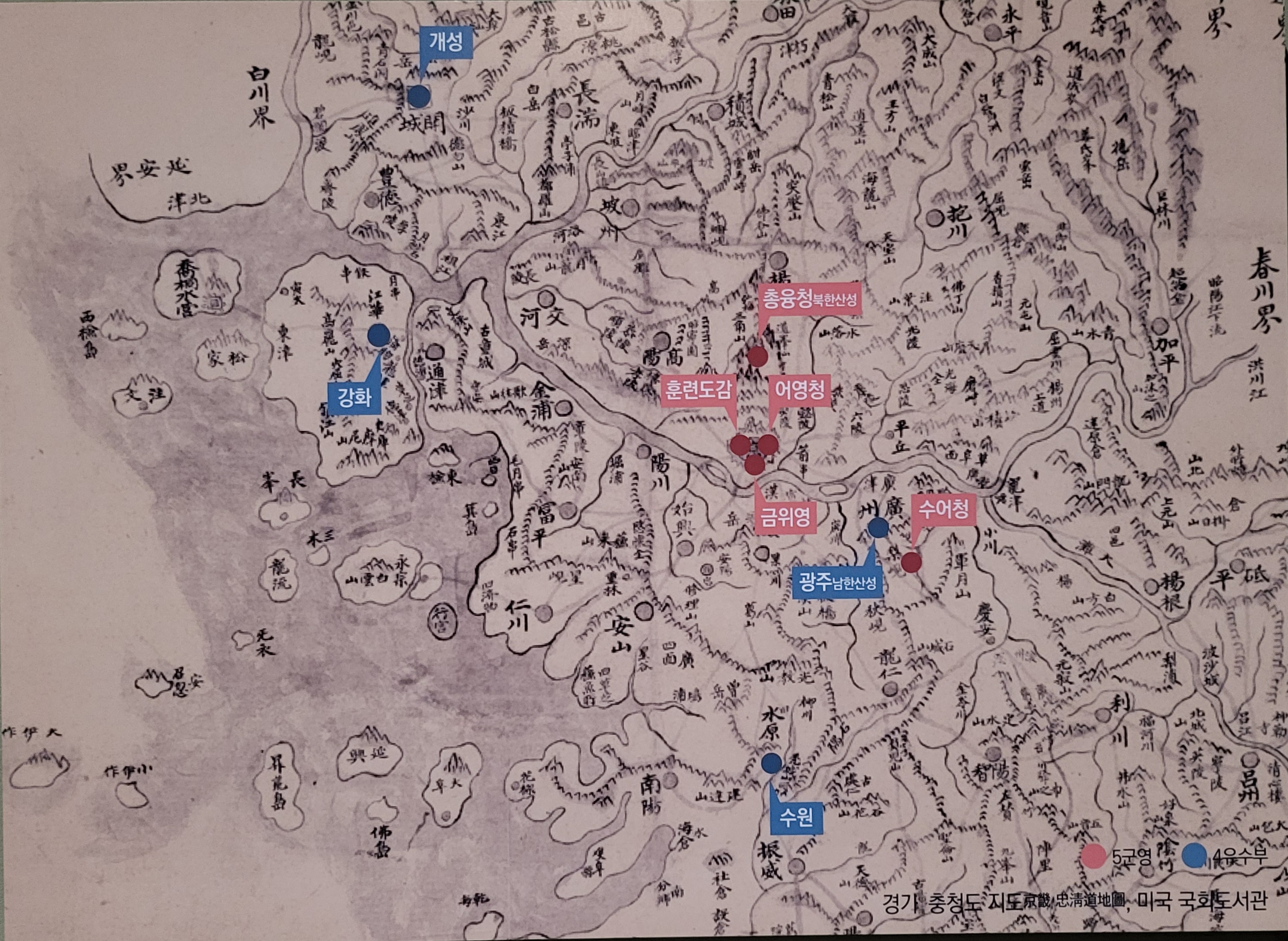 ハニャン(漢陽)をはじめとする全国を「五衛」に分けて防御さしていた軍事システムは、文禄・慶長の役により一瞬にして崩壊してしまいました。戦乱の中、領議政のユ・ソンリョン(柳成龍)の建議により首都防衛のための「訓練都鑑」を、地方には「束伍軍」を設置し、国難を克服しようと努めました。丙子胡乱の時、清は国境の主要な山城に配置された朝鮮軍を迂回して直接ハニャン(漢陽)を侵略し、その結果、インジョ(仁祖)は清の太宗に降伏しなければなりませんでした。その後、朝廷では、国境を守るより首都防衛の方がより重要だということを認識し、首都防衛体制の確立に乗り出すことになります。インジョ(仁祖)のときは、親衛軍やキョンギド(京畿道)防衛軍をそれぞれオヨンチョン(御営庁)とチョンユンチョン(摠戎庁)に再編し、スオチョン(守禦庁)を設置しました。スクチョン(粛宗)のときは、クミヨン(禁衛営)を設置し、従来の訓練都鑑とともに、五軍営体制が確立されました。ヨンジョ(英祖)のときには、訓練都鑑など三軍門に都城民を編制し、首都の防衛体制を確立しました。チョンジョ(正祖)のときはクァンジュ(広州)とスウォン(水原)に軍政都市のユスブ(留守府)を設け、既存のケソン(開城)、カンファ(江華)、スウォン(水原)とともに、4ユスブ(留守府)を築くようになりました。このようにして首都ハニャン(漢陽)を中心に、内・外郭の防衛体制が整備されました。18世紀末期、4つのユスブ(留守府)は「四都」とも呼ばれました。これにより、朝鮮は京都に加え、4つの独立した別都を擁するようになります。キョンド(京都)-四都の領域は、今日の首都圏の範囲に重なります。