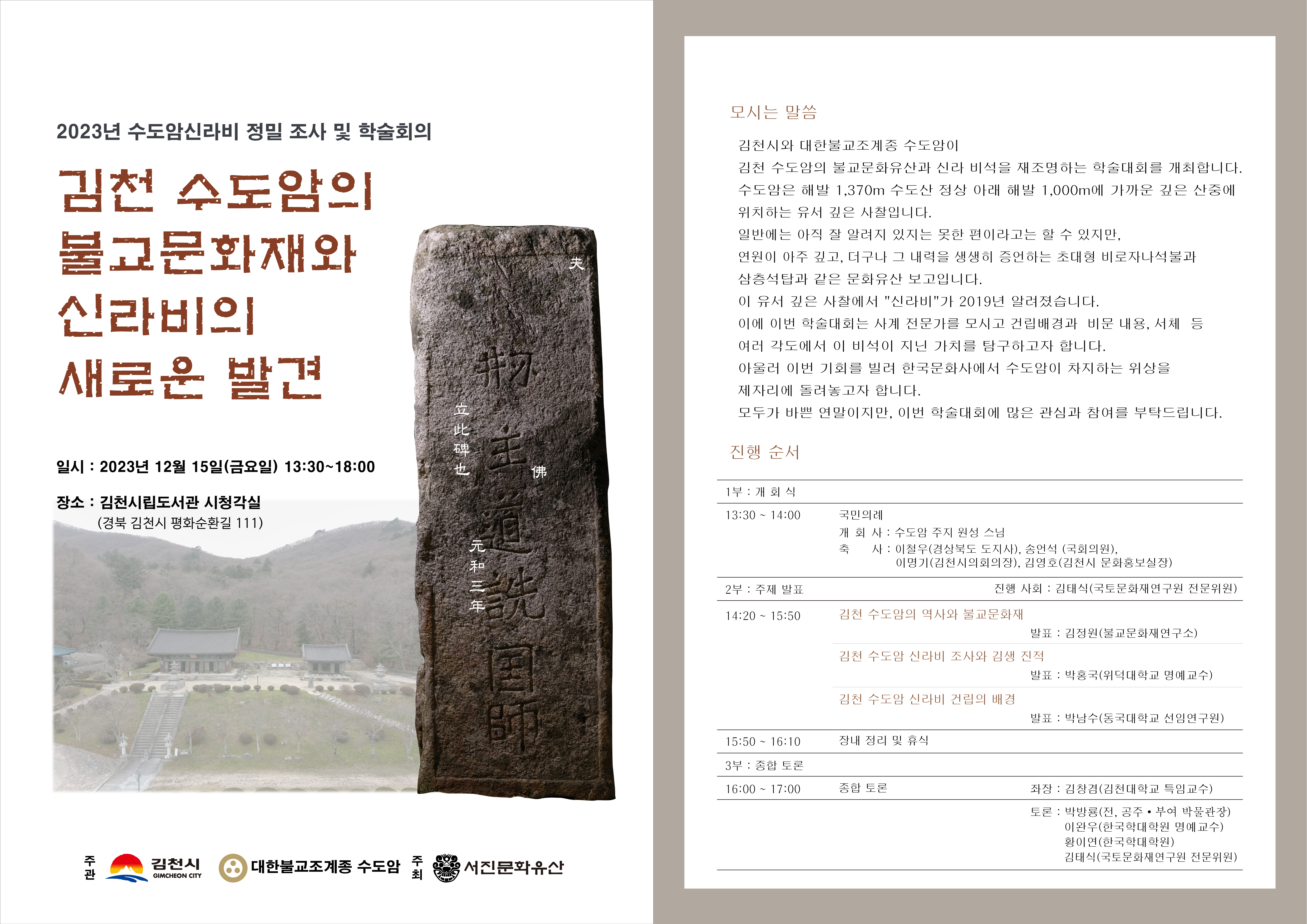 김천시와 대한불교조계종 수도암이 김천 수도암의 불교문화유산과 신라 비석을 재조명하는 학술대회를 개최합니다.