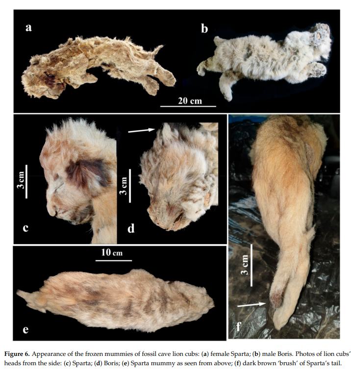 The preliminary examination of the cubs’ mummies shows that the colour of the hair coat was changing from the juvenile yellowish-brown shade to a more ‘adult’ one, light grey to brown, at some point between 1–2 weeks and 1–2 months. Adult lions probably had light grey hair, well adapted to the Siberian Arctic, which is snow covered for two-thirds of the year.