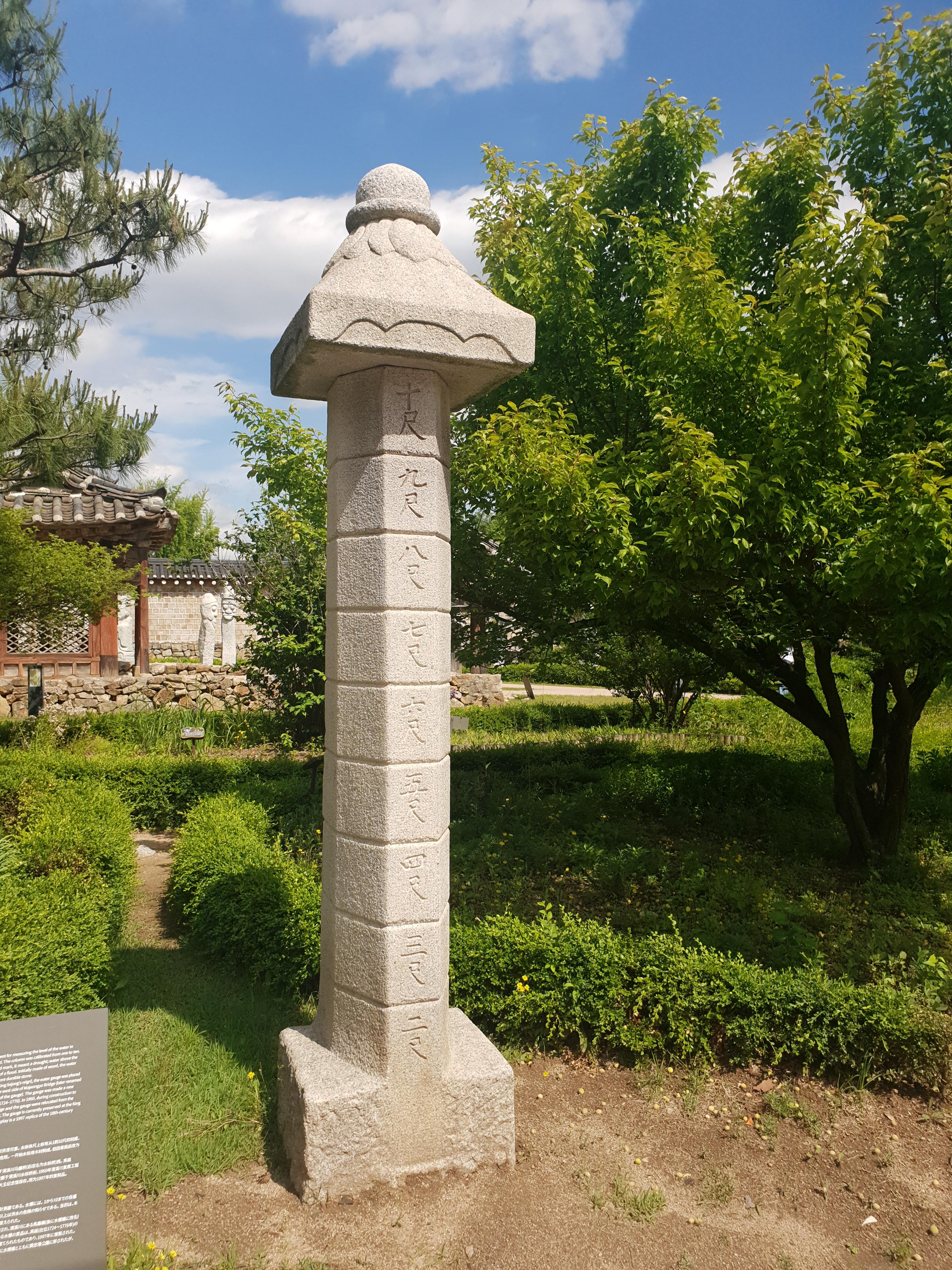 가뭄과 홍수를 대비하기 위해 하천 물높이를 재는 측량기구로, 몸체에는 1척부터 10척까지 눈금이 표시되는데, 3척 이하는 가뭄, 9척 이상은 홍수의 위험을 알려주게 되어 있다. 처음에는 나무로 만들었는데, 쉽게 상하는 단점이 있어 돌로 바꾸었다.