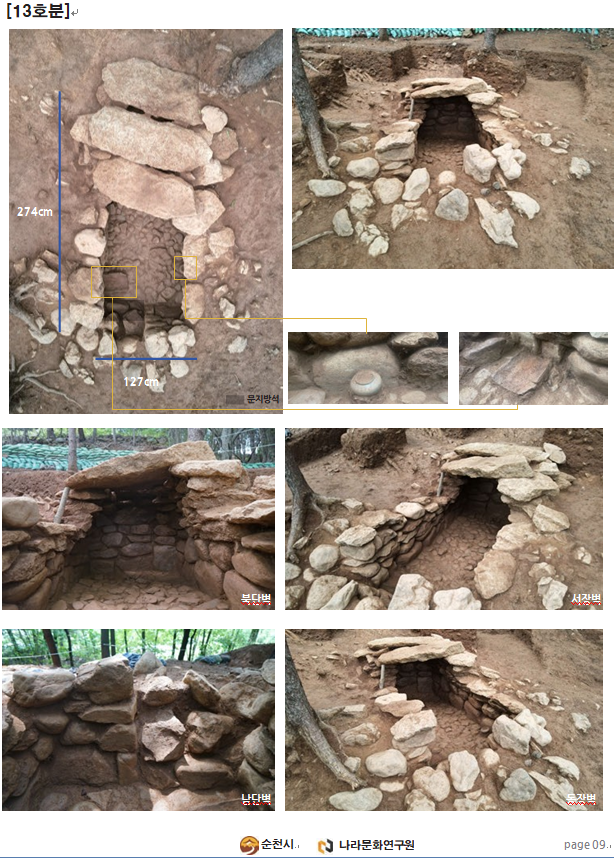 특히 이번에 조사된 13호분(보도자료는 이렇게 썼지만 12호분인 듯하다)은 석실 내부를 정연하게 눕혀쌓기하여 매장주체부를 만들고 입구는 문주석, 문지방석 등의 문틀구조를 갖춘 횡혈식석실로 전남 동부지역에서 도굴이나 훼손 없이 확인된 첫 번째 사례라는 점에서 의미가 크다. 매장주체부에서는 금제이식(귀걸이)을 비롯해 백제의 전형적인 특징을 보이는 토기들과 쇠화살촉, 쇠낫, 쇠손칼, 쇠관못 등이 출토됐다.