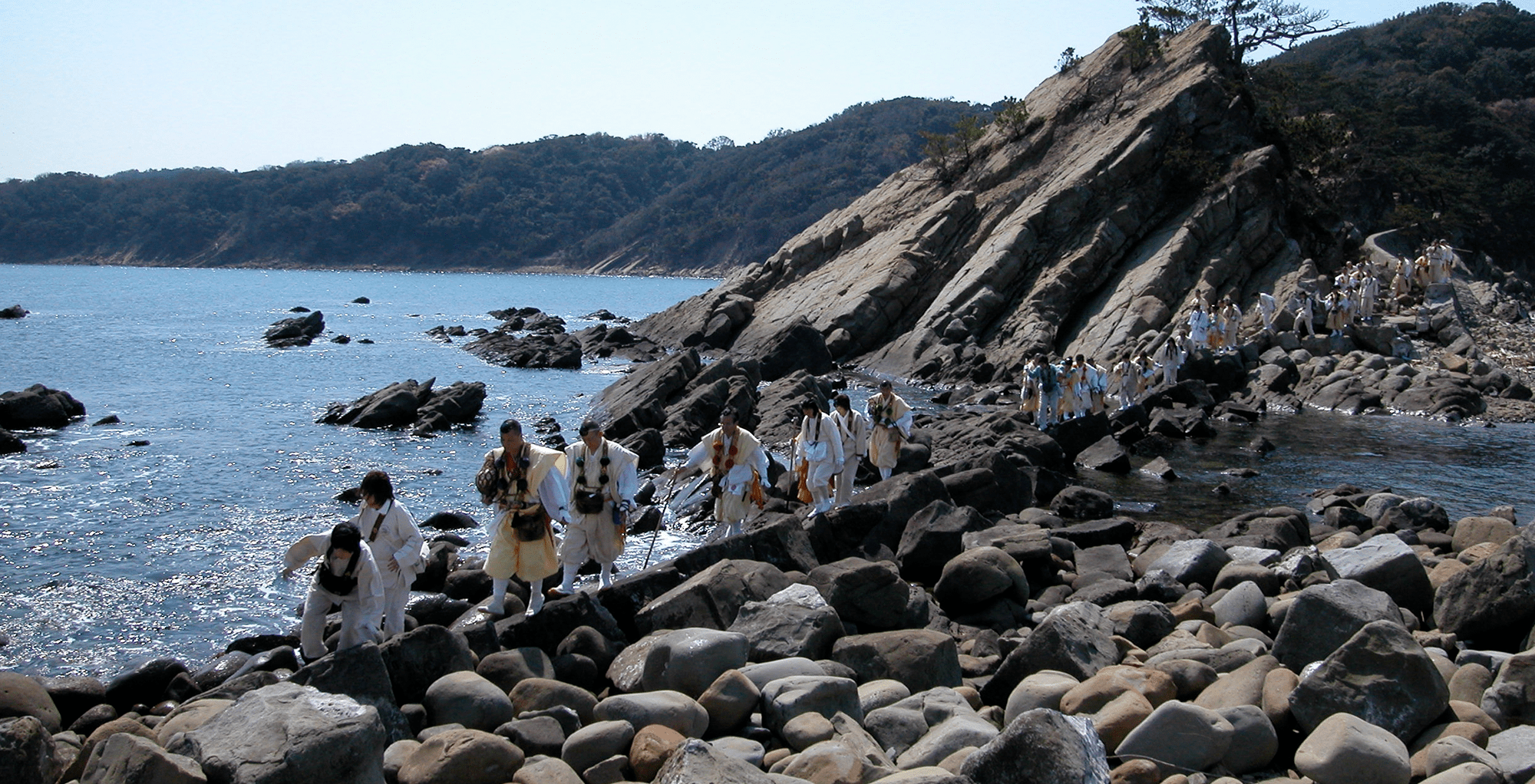 슈겐도 입회의식? 니시노조기 라 부르는 모양이다. 절벽에 몸을 띄우게 하고 신앙에 관련된 문답을 한다. 이 행사는 원래 지금보다 훨씬 살벌했는데 행사중 절벽에 추락해 죽는 사고가 생겨 지금은 많이 말랑말랑해졌다고 한다. 저 자세에서 서쪽을 보게 하기 때문에 니시노조기 라는 이름이 붙었다.