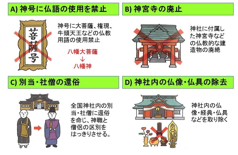 메이지신정부는 불교와 신도가 뒤섞인 사원에서 불교적 요소는 불교사원이 유지하되