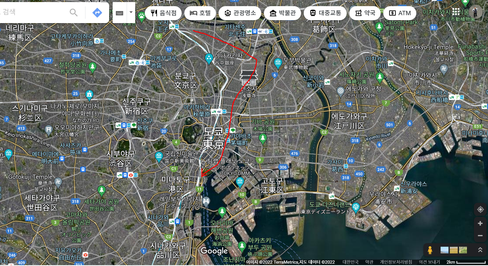붉은 색 줄로 표시한 데가 바로 스미다 강이다. 그 오른쪽 큰 강이 황천 아라가와다.