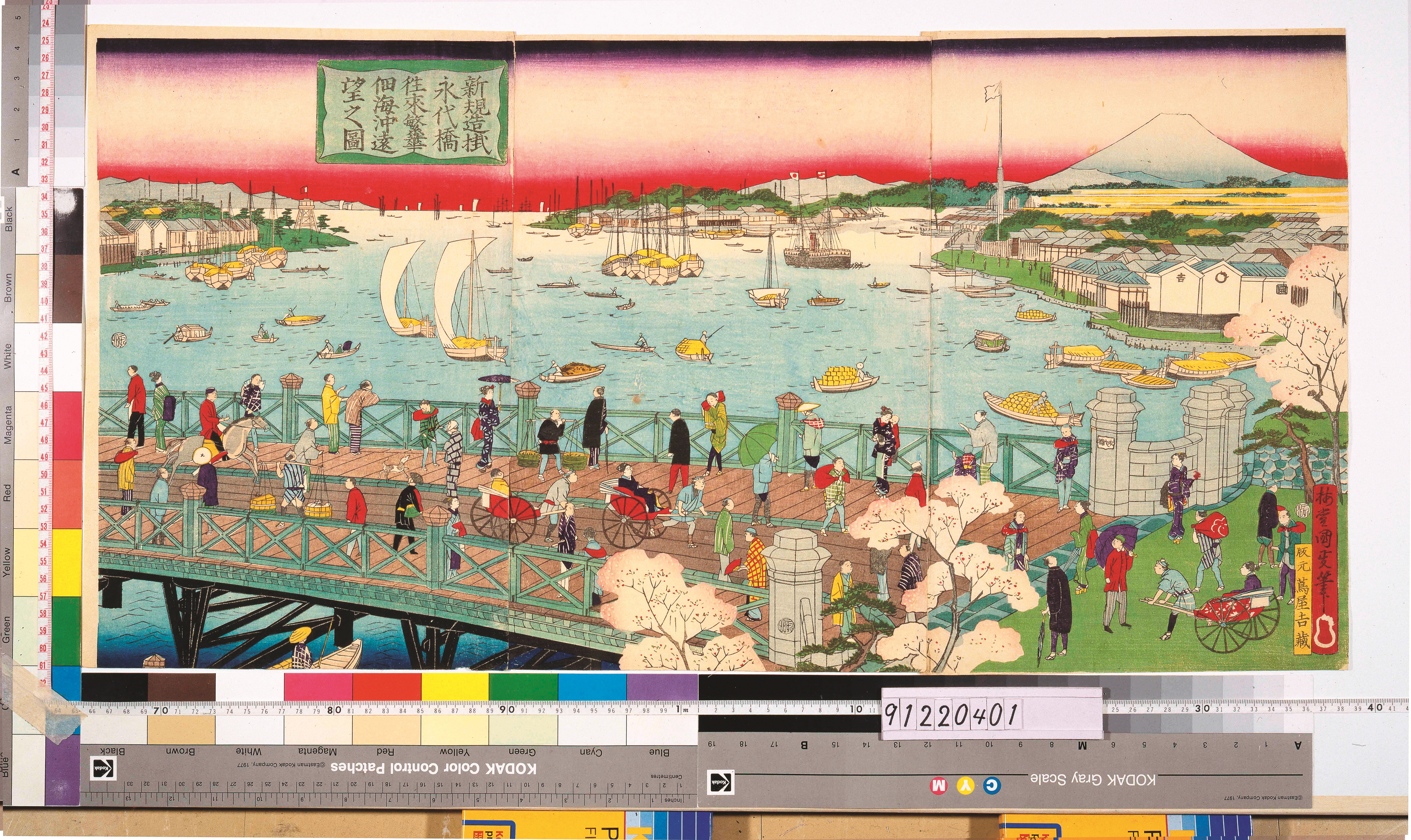 서양식 목교가 된 에이타이바시와 그 일대의 모습 新規造掛永代橋往来繁華佃海沖遠望之図 5대 우타가와 구니마사(歌川国政 五代, 생몰년 미상) l 1875년