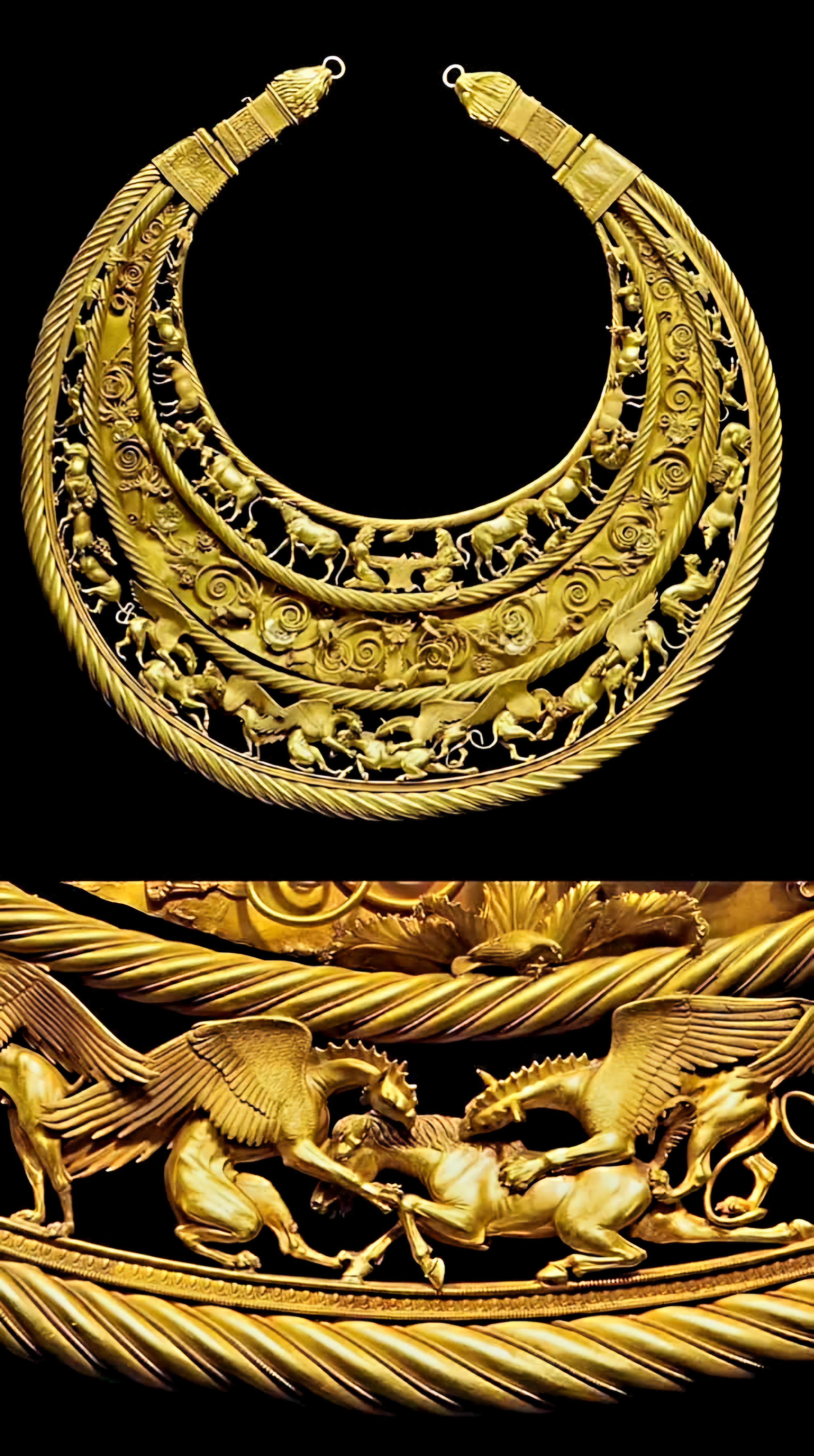 기원전 4세기 스키타이 무덤 출토 왕가의 Breast gold decoration, 곧 가슴걸이 장식이라 한다.