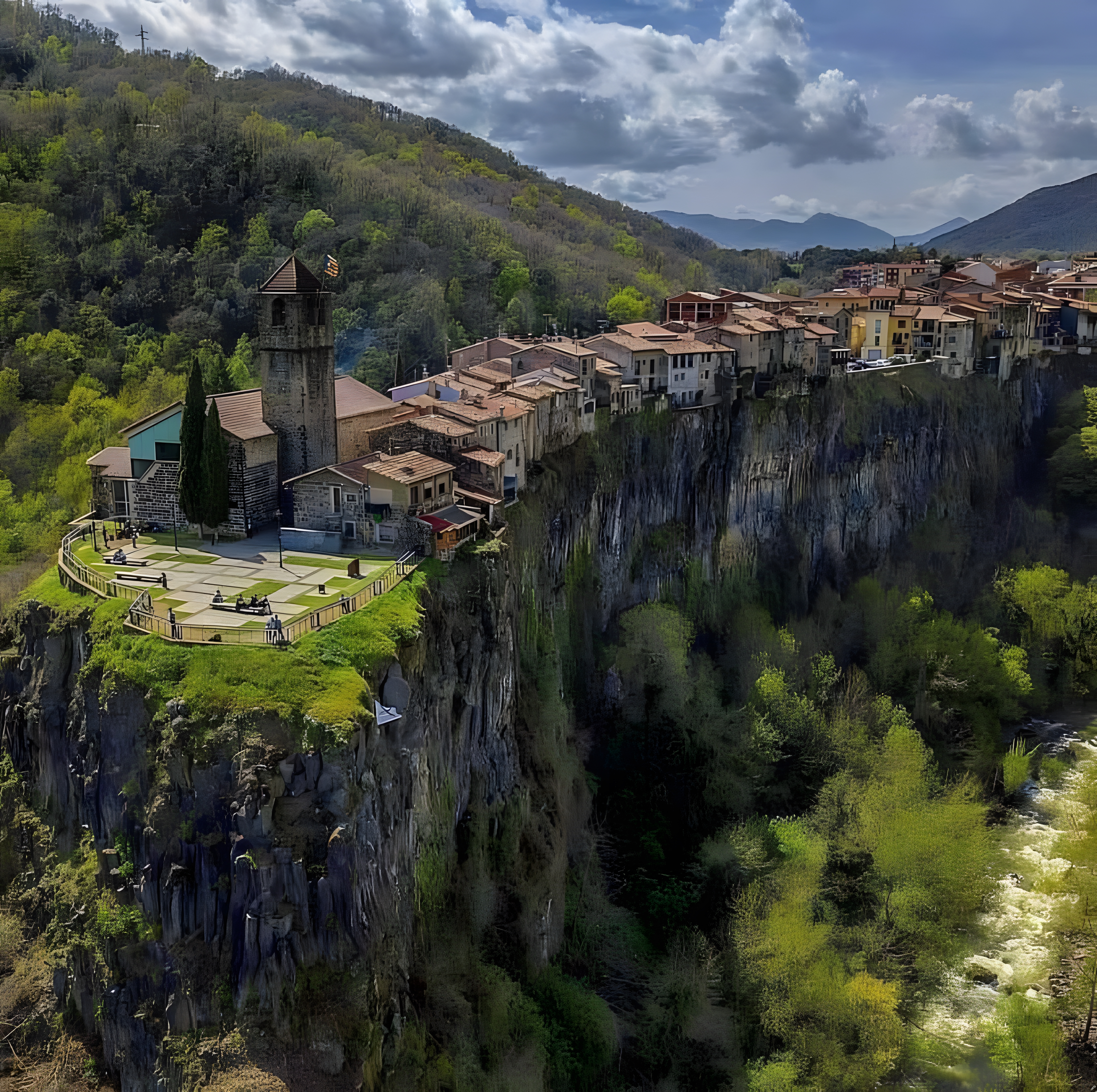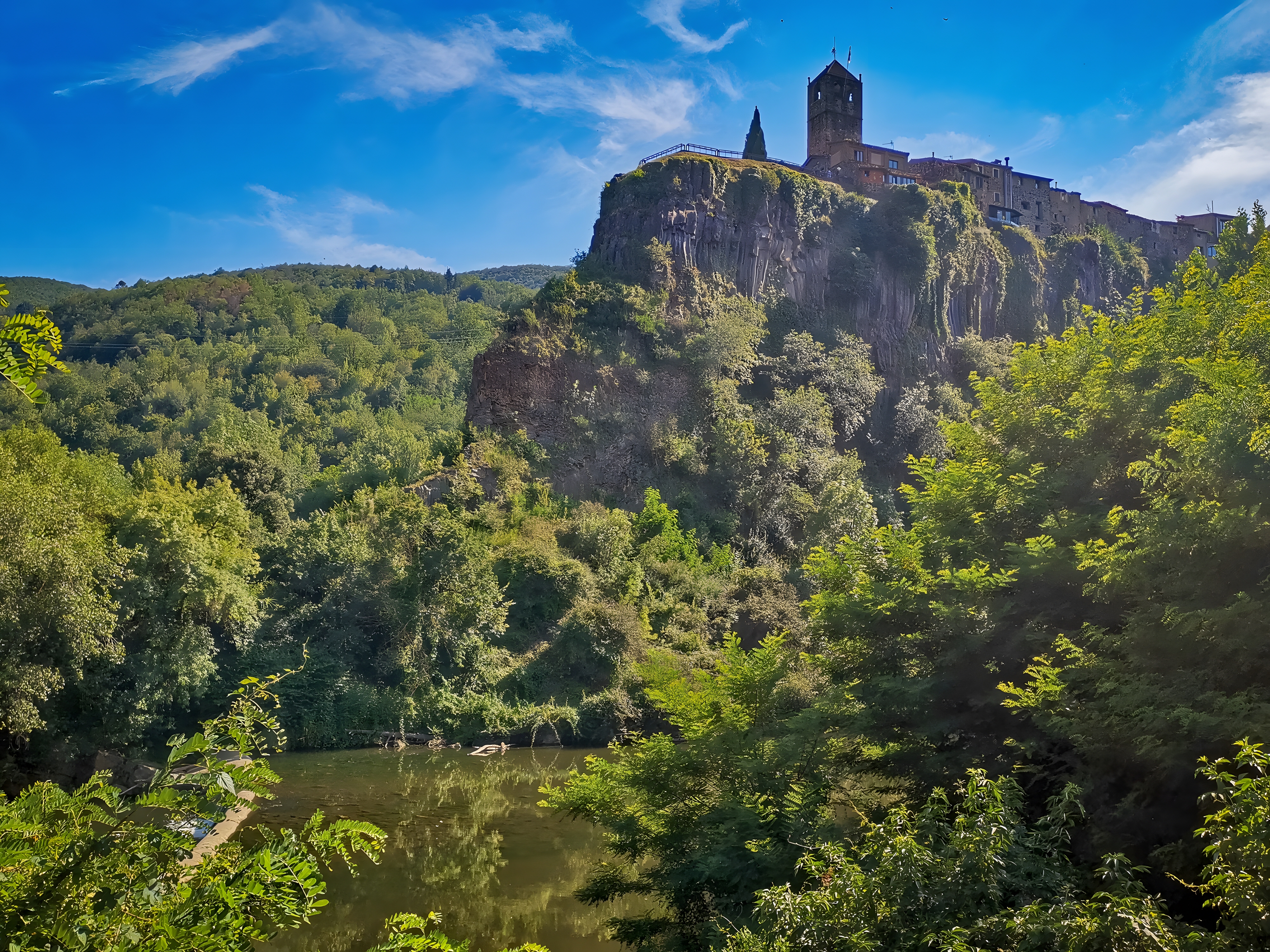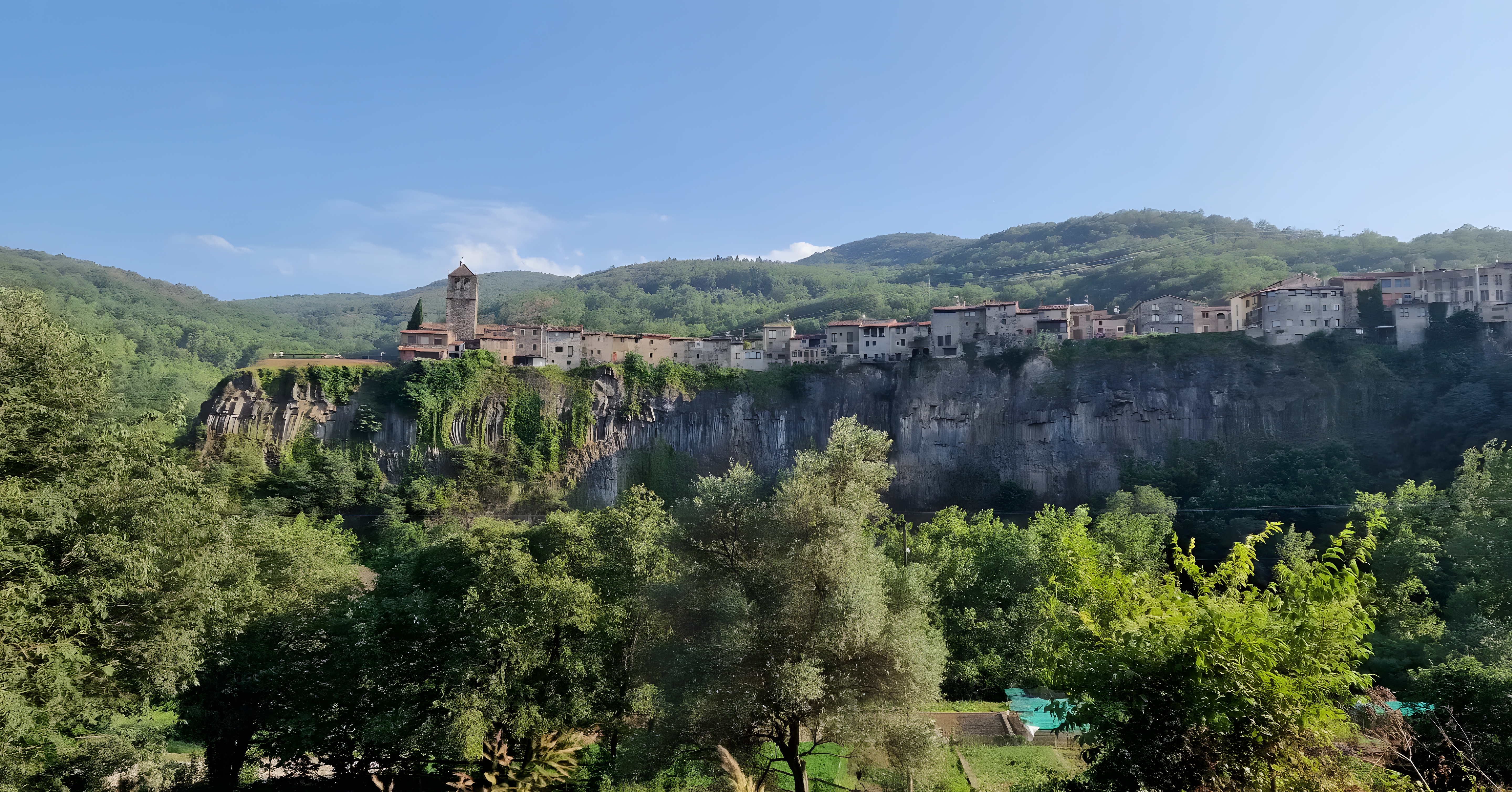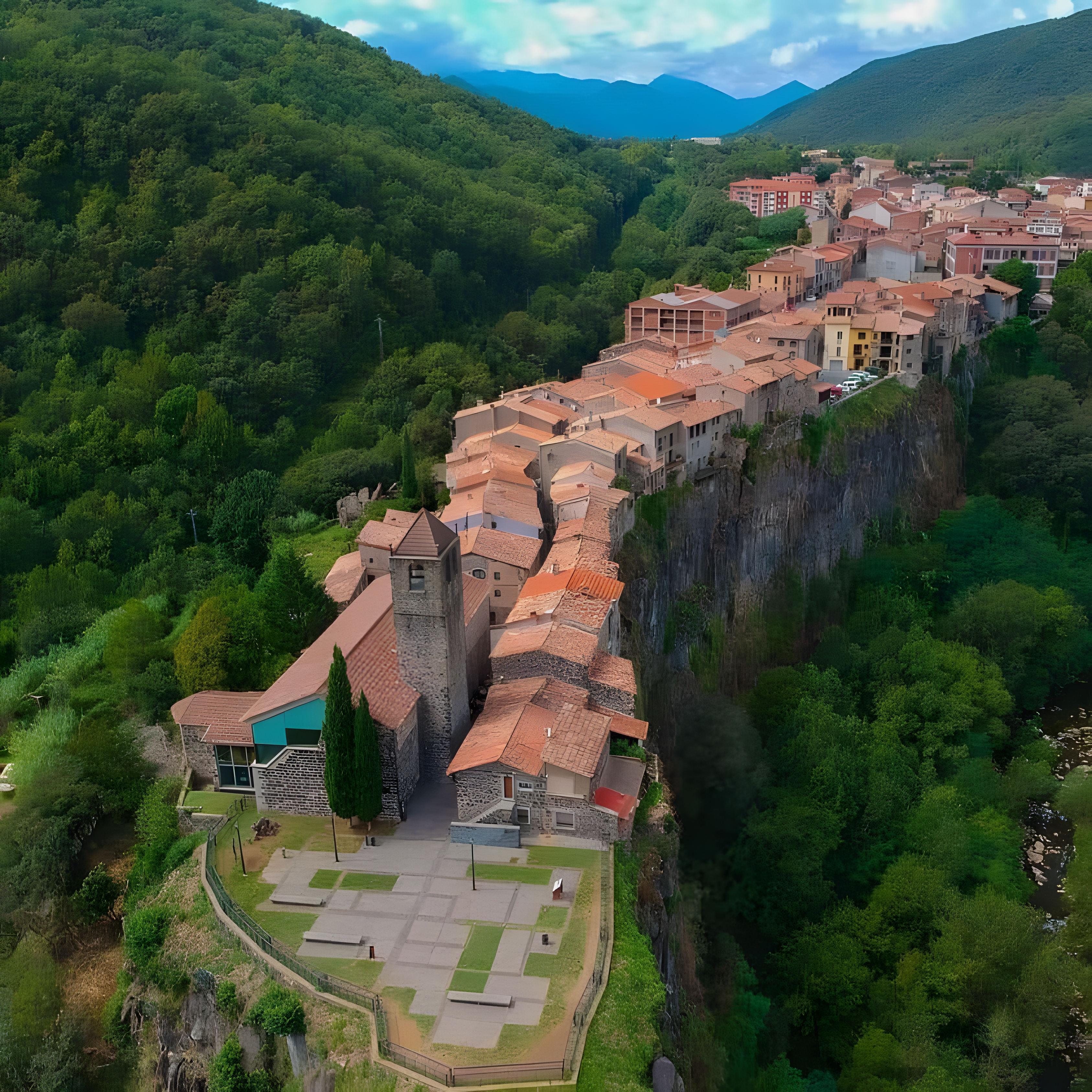 도심 구역은 플루비아Fluvià 강과 토로넬Toronell 강이 합류하는 지점과 접하며, 그 사이에 현무암 절벽에 솟은 마을이 있다.