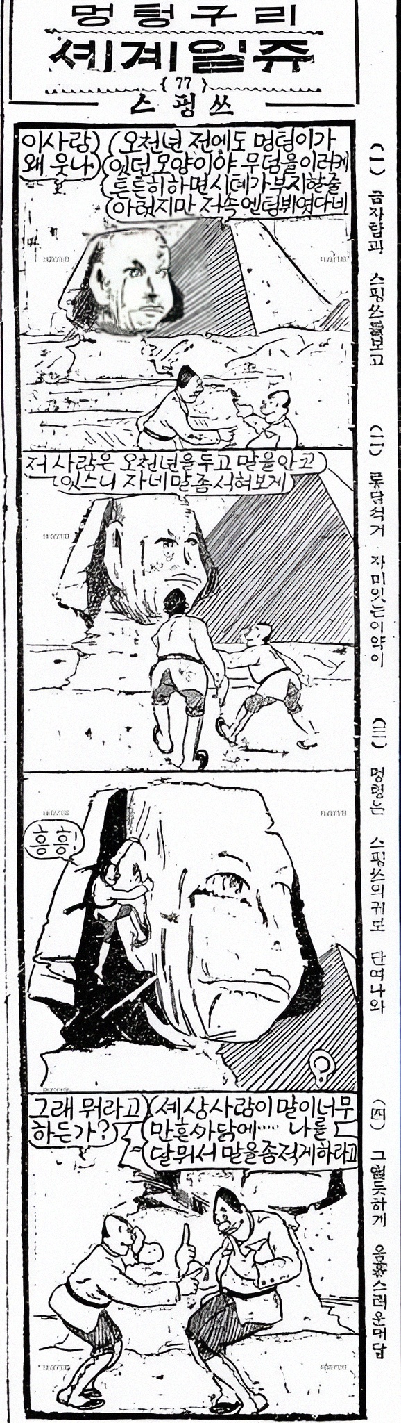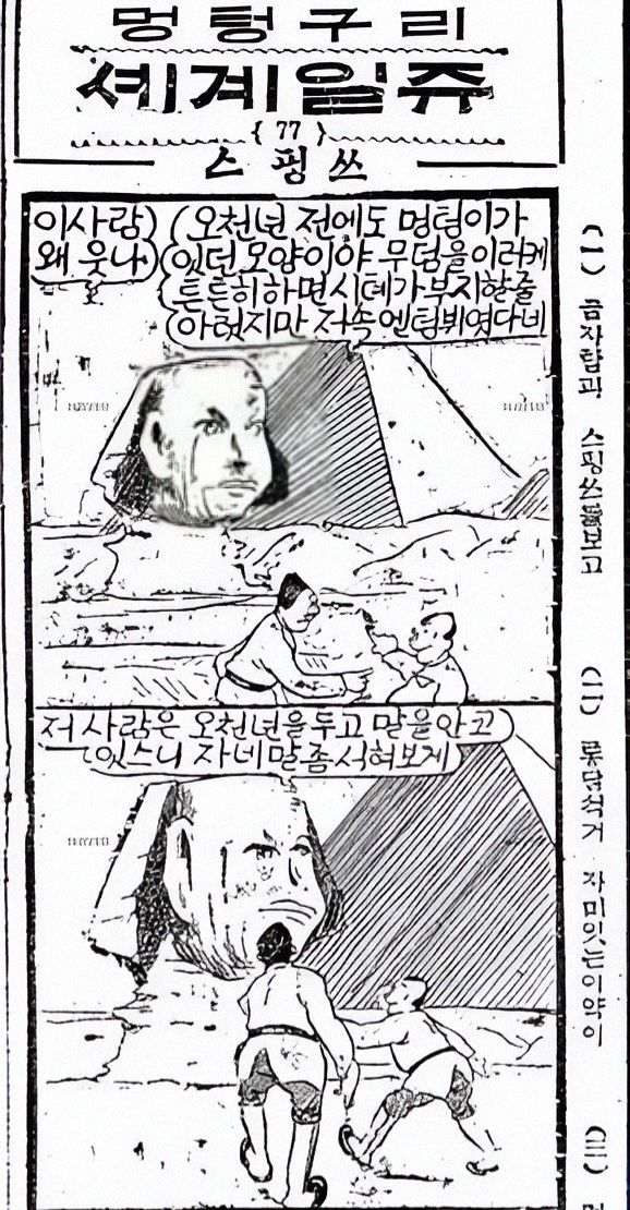 <멍텅구리>의 주인공들이 단엽 프로펠러기를 타고 세계여행을 하는 컨셉의 만화인데, 여기서 그들이 기자의 '금자탑'과 '스핑쓰'를 만나지 않는가.