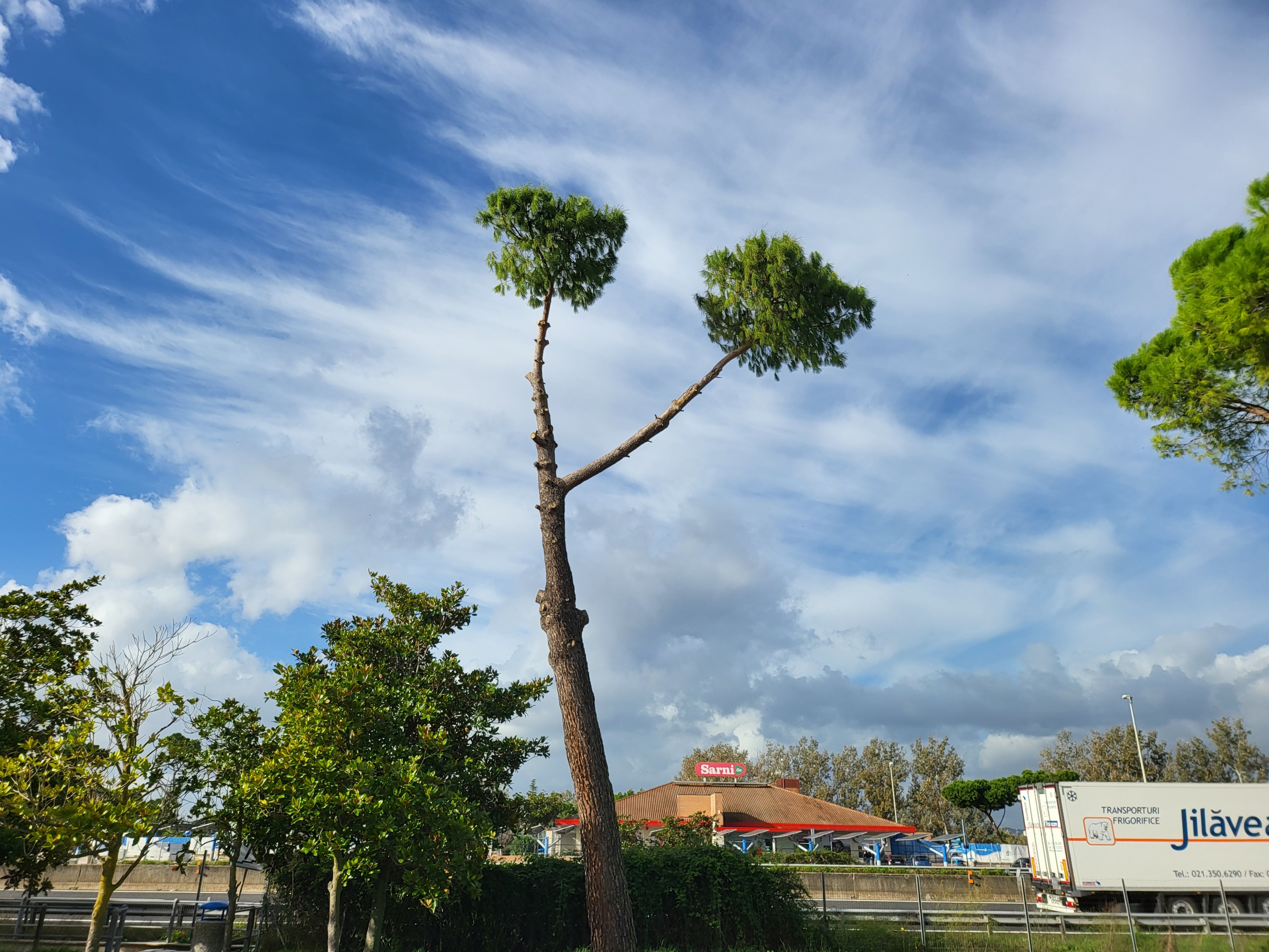 보다시피 싹뚝싹둑 거추장스런 가지는 다 잘라버리고 우리가 로마의 소나무라 할 적에 떠올리게 되는 그런 수형樹形으로 가꾸어 가는 과정에 있음을 안다. 이로써 본다면 우리가 로마의 소나무라 표상하는 그 모습은 실상 극단하는 전지剪枝의 결과임을 안다.