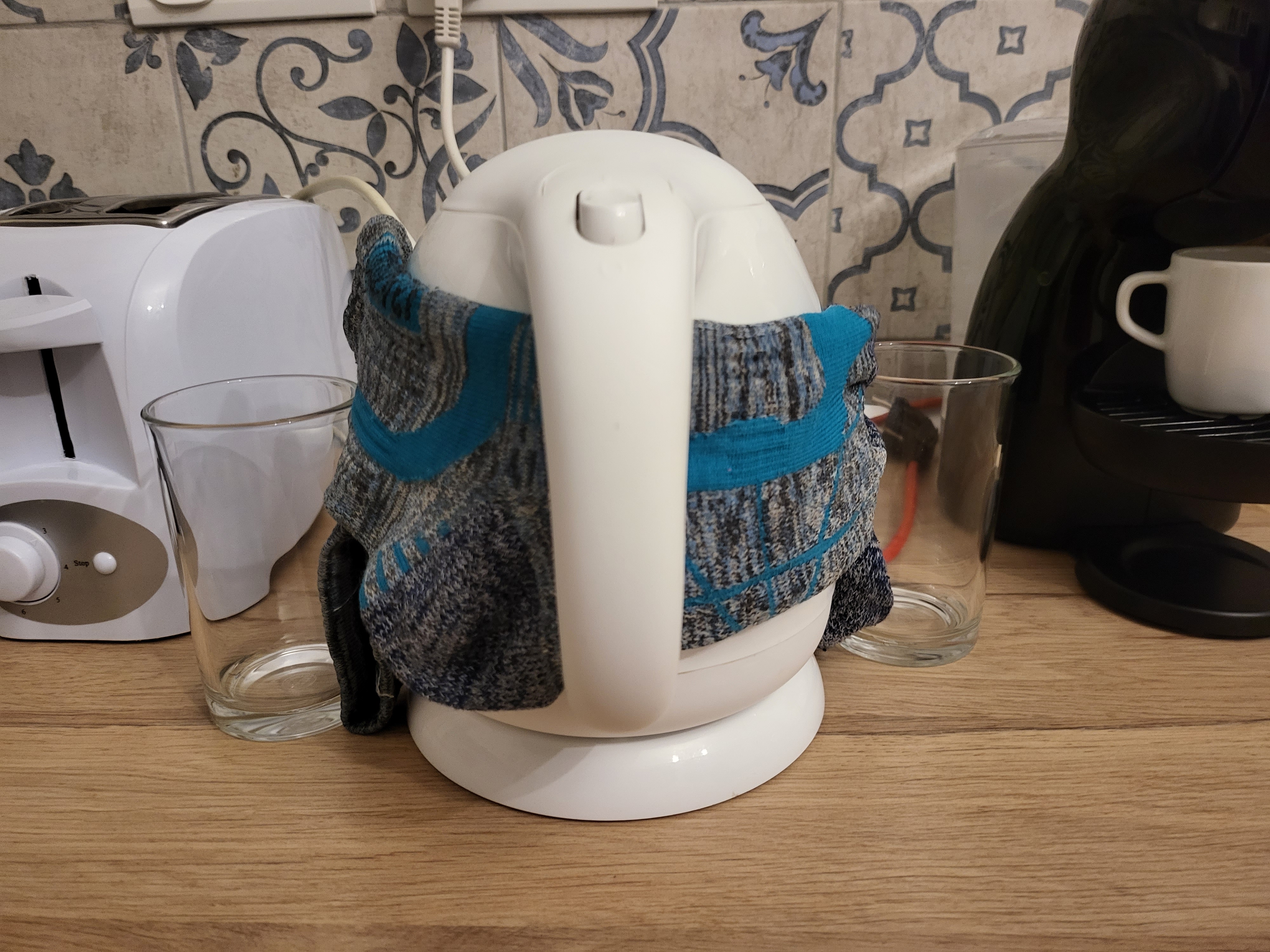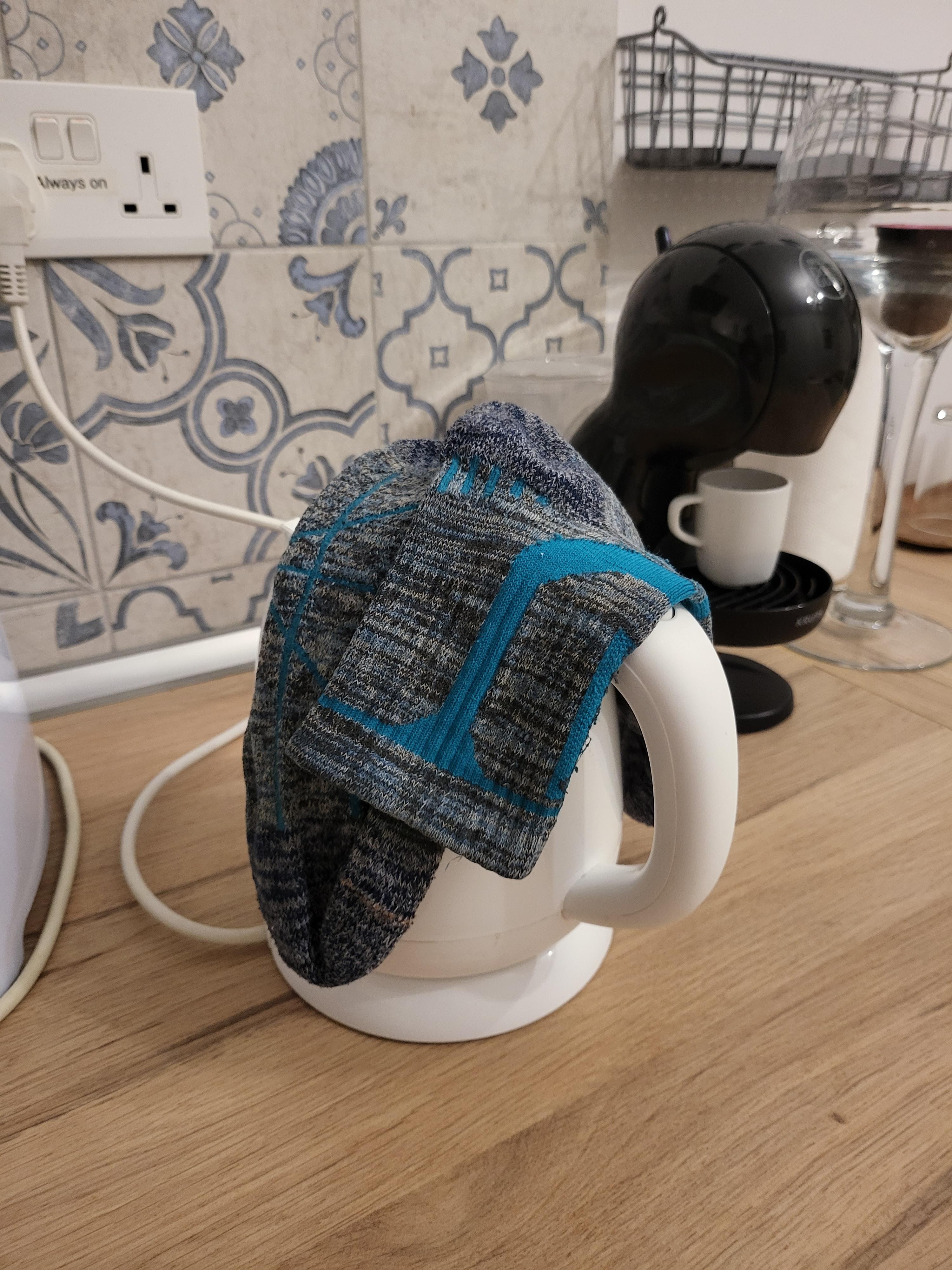 몸통을 둘러 한 짝을 걸쳤으니 유리잔 두 개를 갖다대니 양말이 포터 몸통에 달라붙는다.