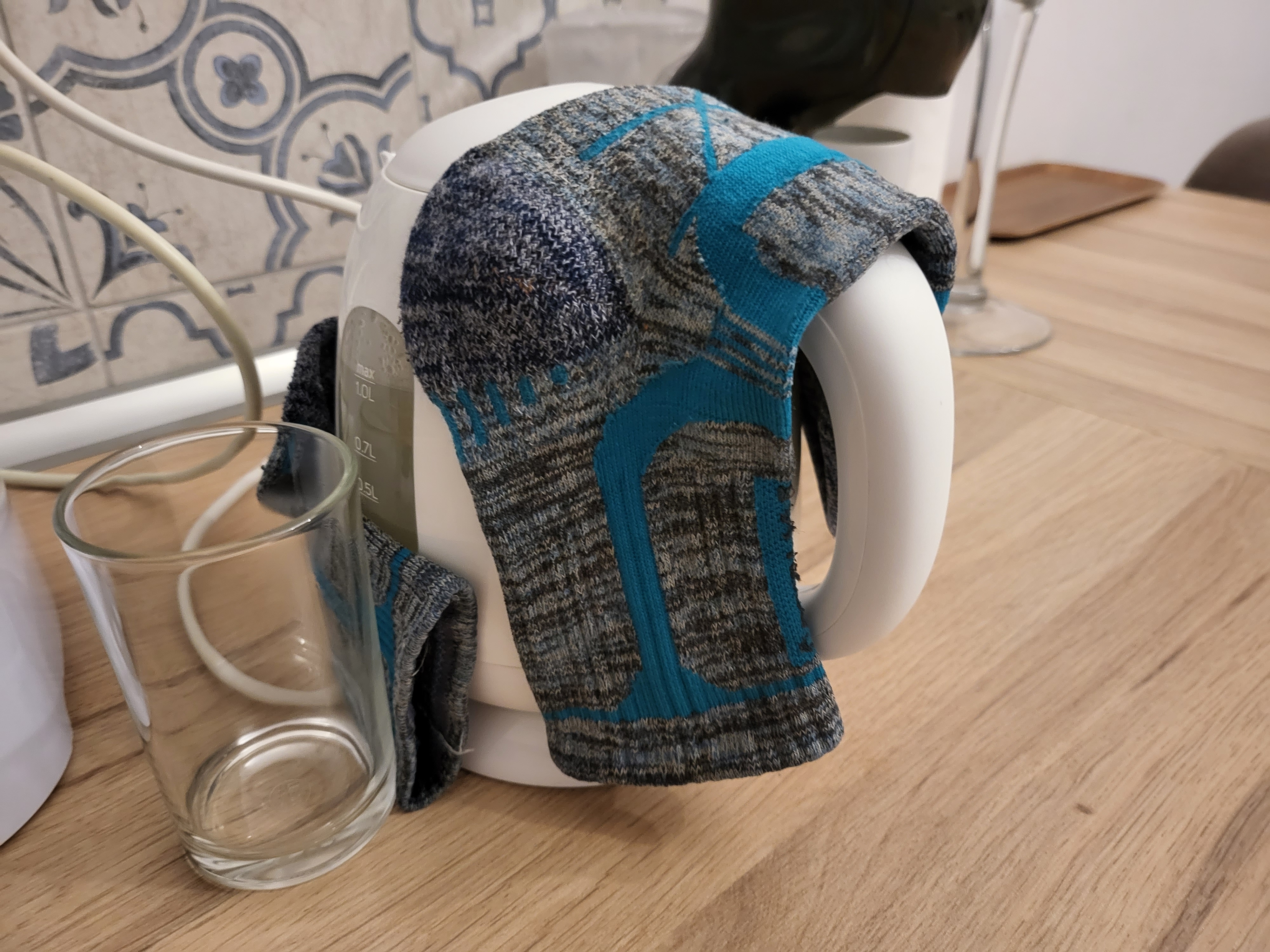 몸통을 둘러 한 짝을 걸쳤으니 유리잔 두 개를 갖다대니 양말이 포터 몸통에 달라붙는다.