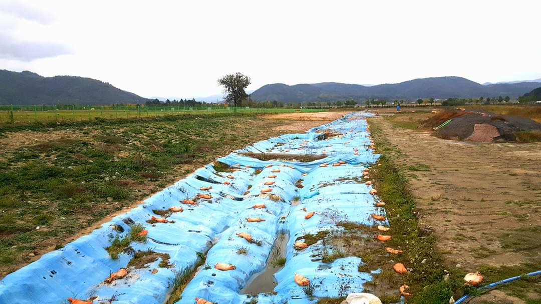 사진이 확연히 드러내는지 자신이 없으나 왼편 절터에 견주어 파제끼고 갓빠로 덮은 지점이 고도가 뚝 떨어진다.