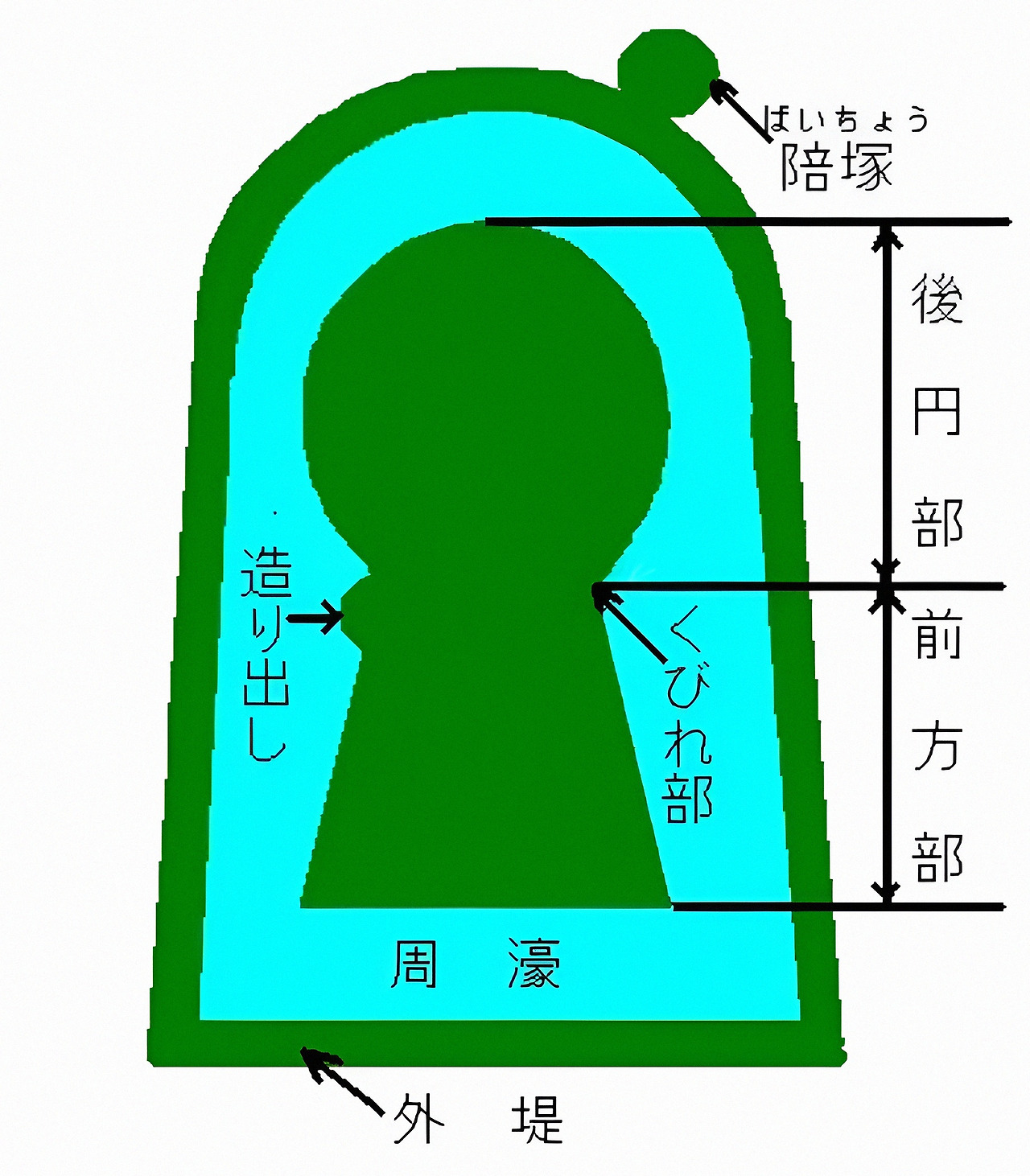 저런 무덤을 전방후원분이라 하는데, 시체를 묻는 공간은 봉분을 둥글게 만드는 대신, 그 앞쪽에 사각형 비스무리한 마당을 붙여 놓았기에 저리 부른다. 공중에서 바라보면 악기 장고를 닮았다 해서 한국에서는 장고형 고분이라 부르기도 한다.