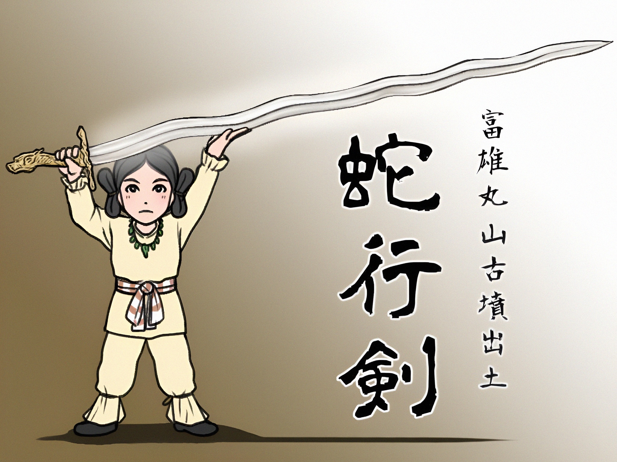 다음 사행검蛇行剣이다. 다코켄だこうけん이라 읽는 이 말은 적어도 글자 그대로만 해석하면 뱀이 기어가는 듯한 형상을 한 칼을 말한다. 고분시대古墳時代 철검鉄剣 중 하나로, 칼 중에서도 몸통이 뱀 몸둥아리처럼 굽은 만곡을 이루는 형상을 했다 해서 이런 이름을 얻었다.