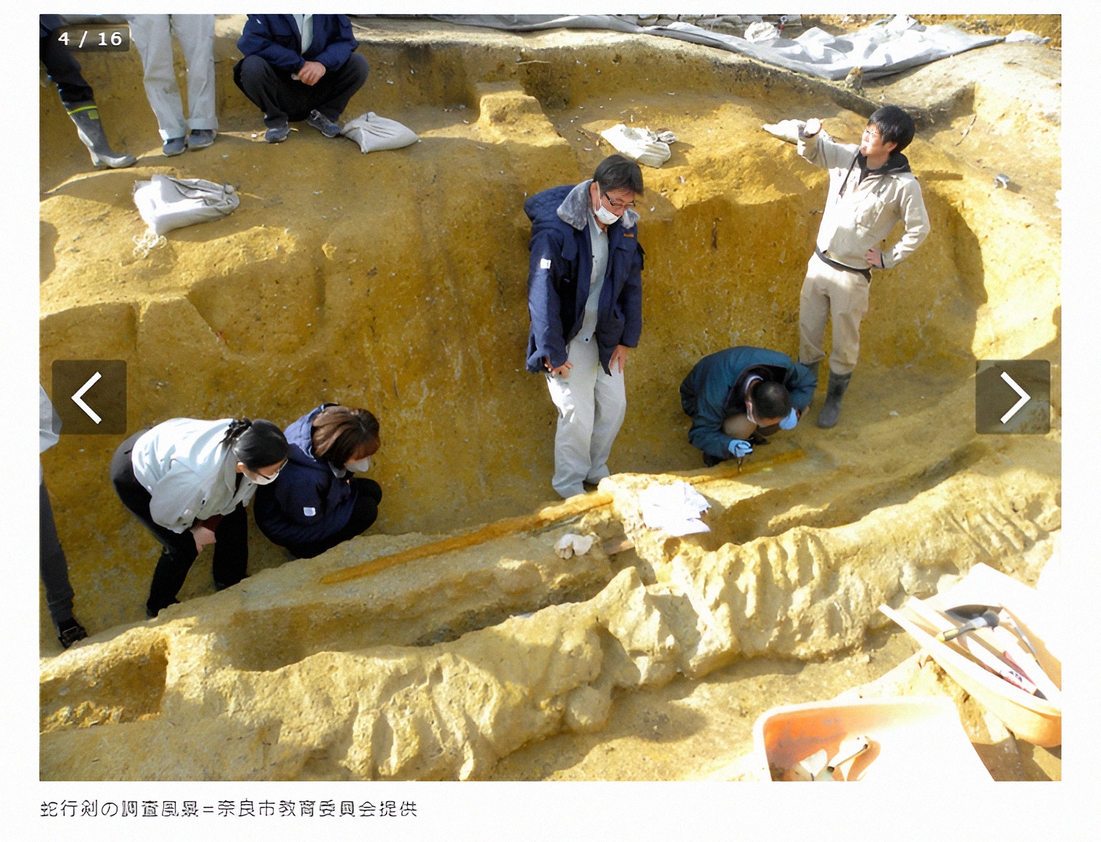 그 긴 관 방향을 따라 놓인 이른바 사행검蛇行剣이라는 몸체가 구불구불한 길이 2.37m짜리 초대형 이른바 의식용 칼이 나오고[사진2, 3]