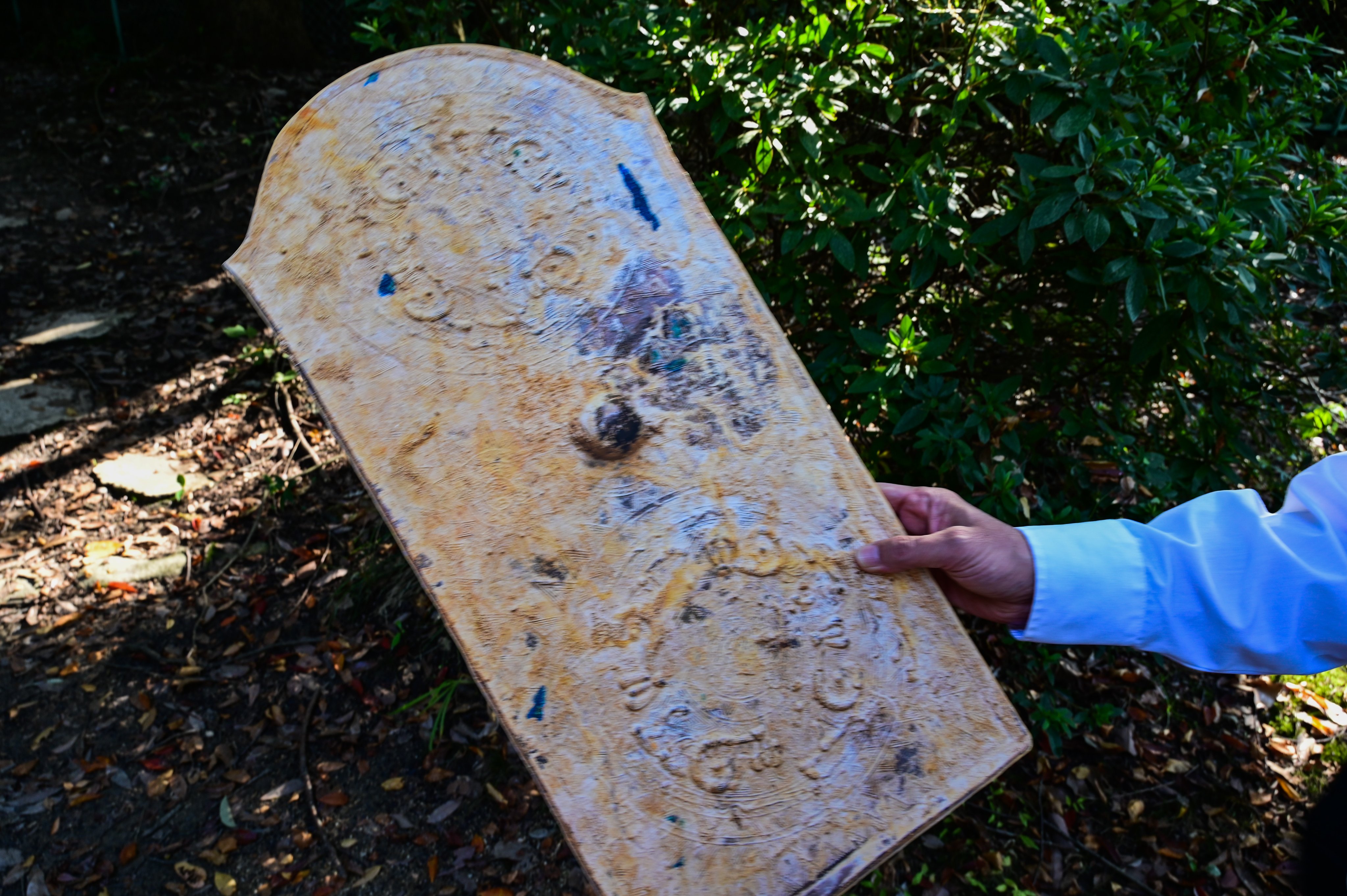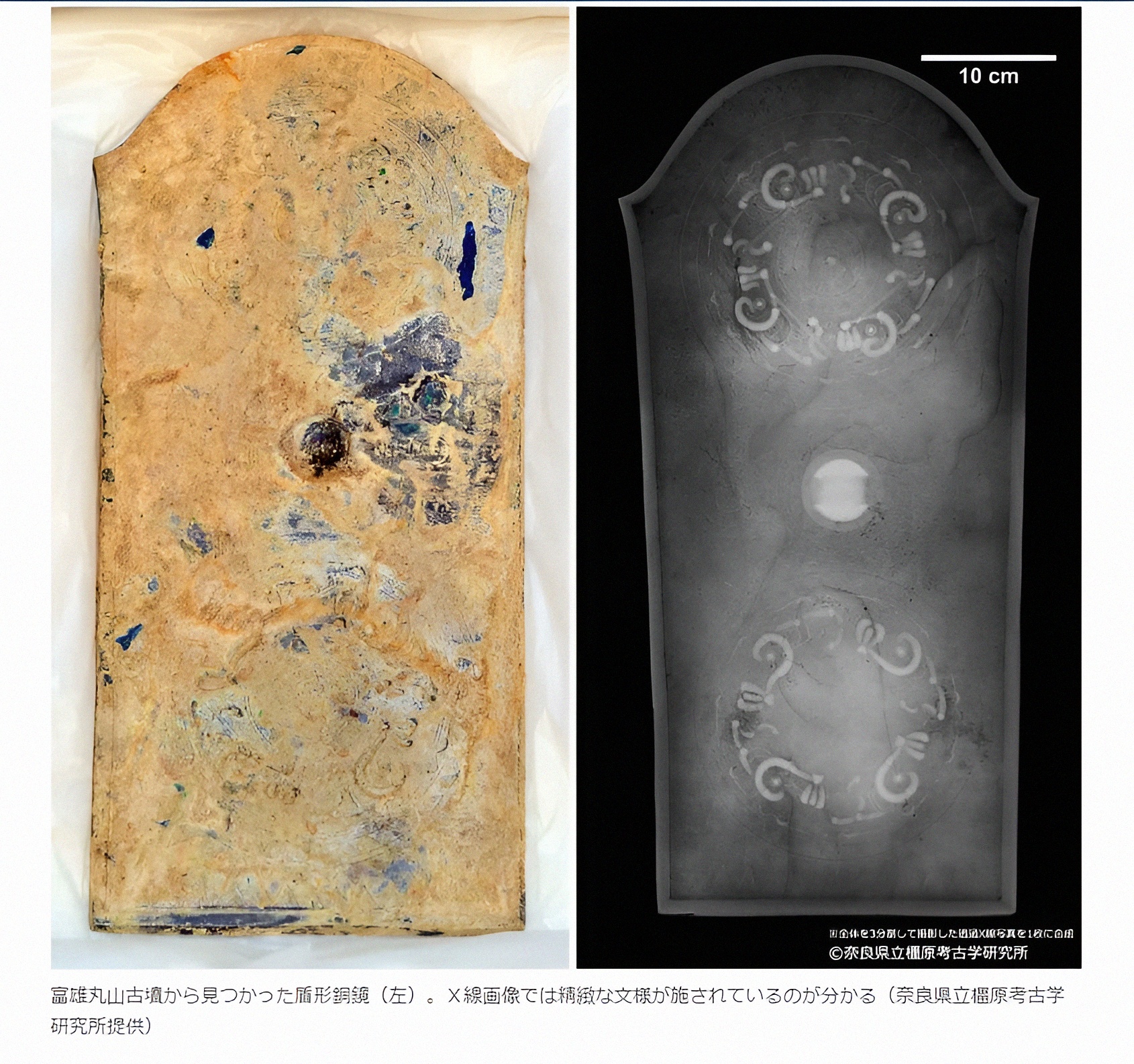 그와 세트로써, 곧 한다발로 타룡문순형동경鼉⿓⽂盾形銅鏡이라는 요상한 이름을 지닌 방패 모양 구리거울이 출토했다. ([아래 도1] )