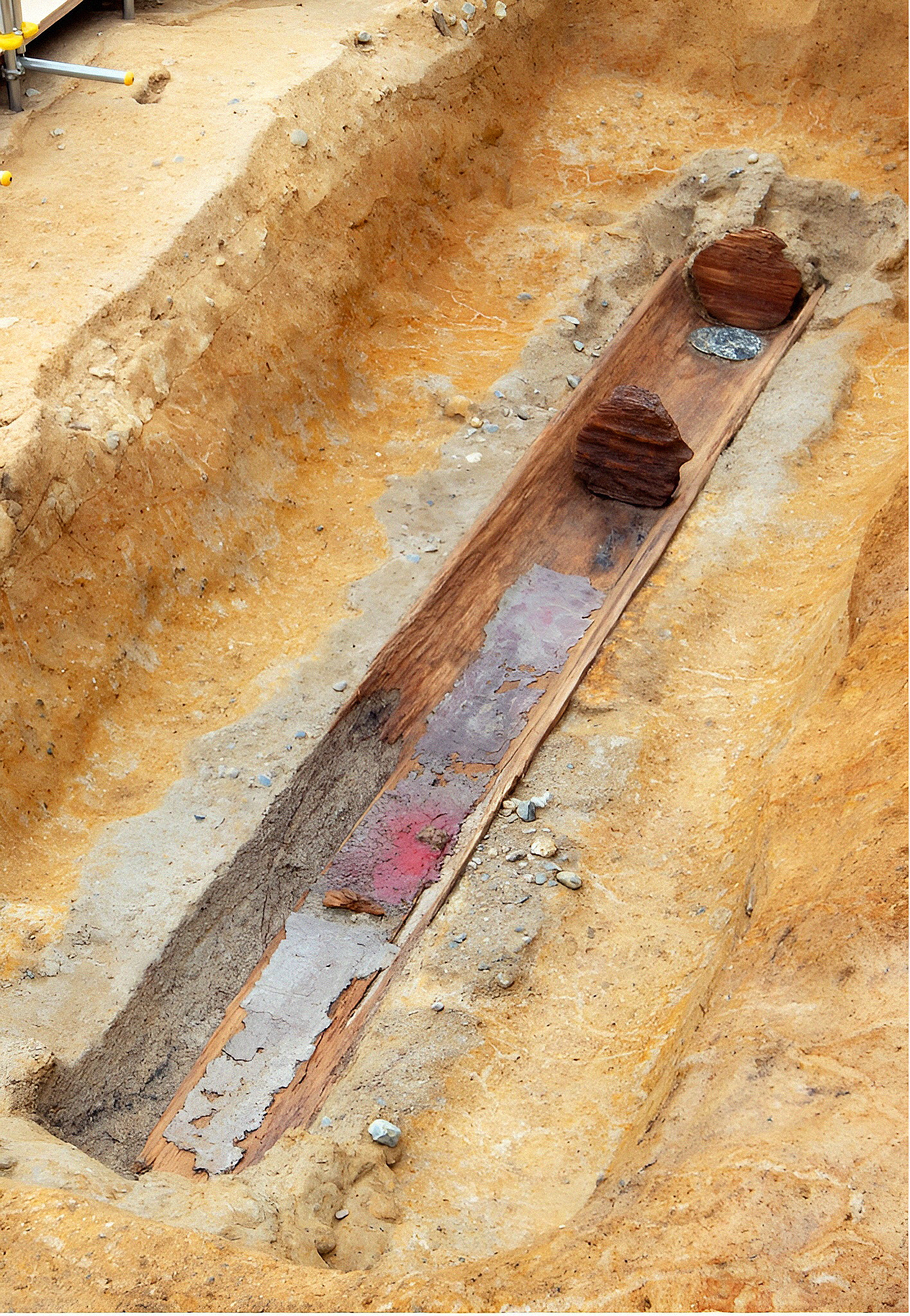 나라시교위 매장문화재센터가 한창 발굴 중인 4세기 후반 무렵 고분시대 부웅환산고분富雄丸山古墳이라는 무덤 통나무 목관 내부 노출 상황이다.