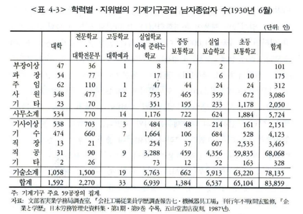 위 표는 1930년대 것이니 1940년대가 되면 전반적인 일본사회 학력 수준이 더 올라가 보통학교 졸업하기도 빠듯한 조선인들로서는 갈 곳이 직공 밖에는 없었다는 말이다.