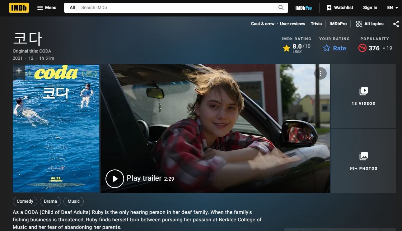 듣자니 Children of Deaf Adults 약자라 해서, 농인聾人 부모에게서 태어난 청인聽人 자녀란다. 부모가 귀가 들리지 않기에, 그에서 태어난 자식은 자연 부모의 귀가 되고 입이 되는 통역사 역할을 하게 된단다.