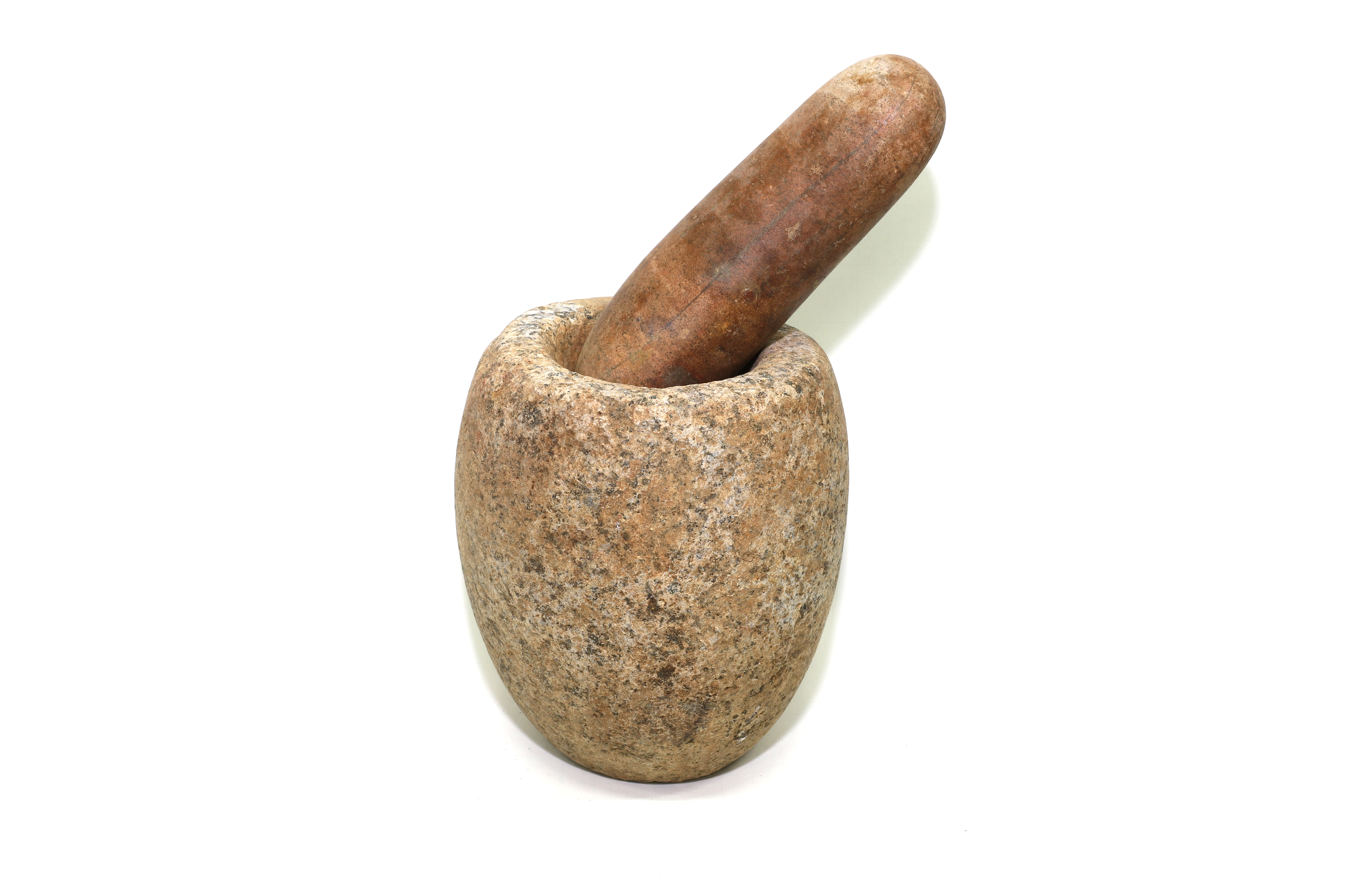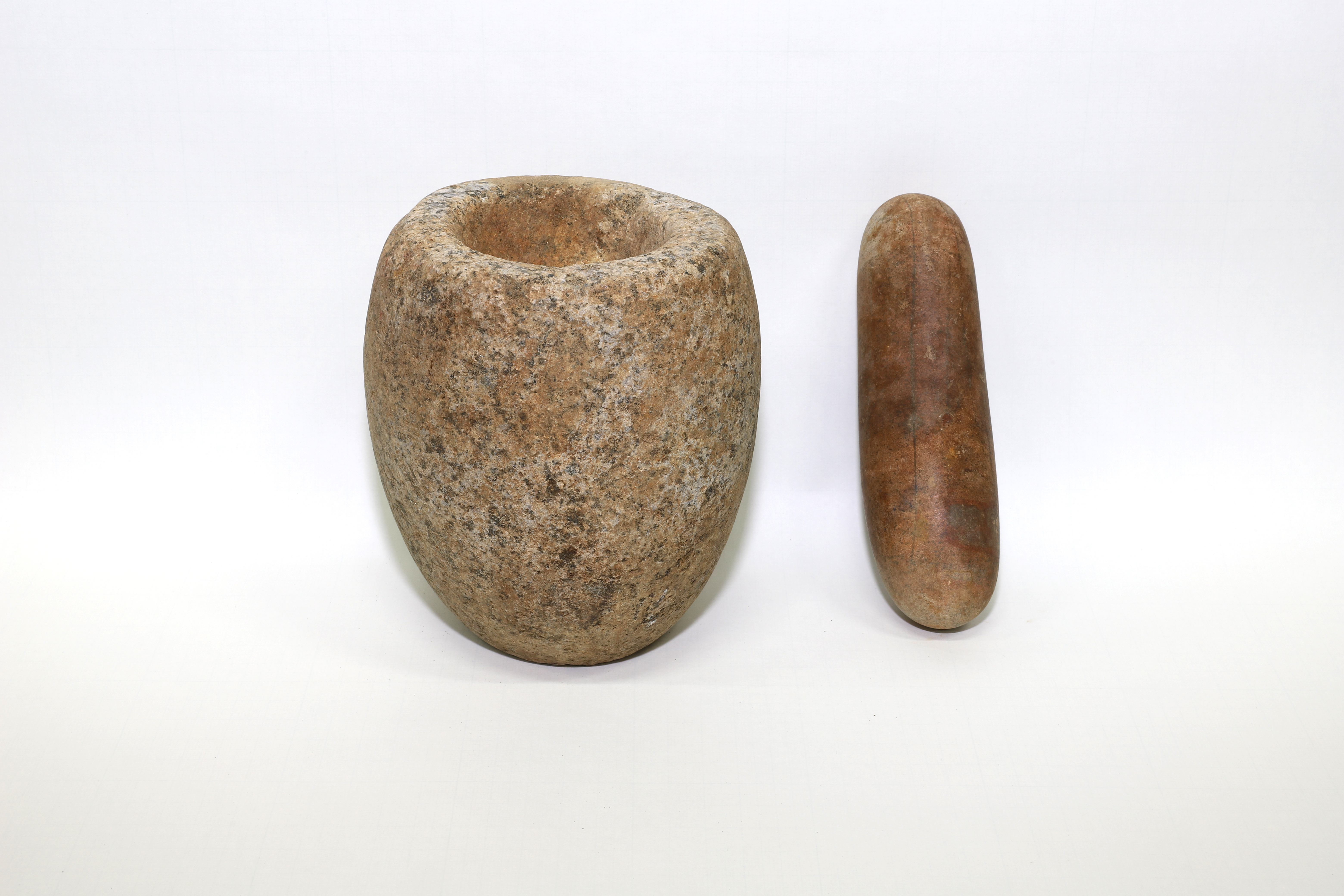 돌절구와 공이는 주인공 머리맡 부장궤(副葬櫃) 안 철솥 바로 옆에서 함께 확인되었다. 돌절구는 바닥이 평평하고 세로로 긴 형태이며, 화강암을 연마하여 위쪽에 얕은 함몰부를 만들었다. 돌절구의 크기(높이 13.5cm, 폭 11.5cm)와 함몰부의 용량(약 60ml)으로 보아 곡물을 빻는 실질적인 용도라기보다는 상징적 의미로 부장되었을 수도 있고, 약제를 조제하는데 사용한 약용 절구(현대의 막자사발과 같은 용도)로 추정해 볼 수 있다.