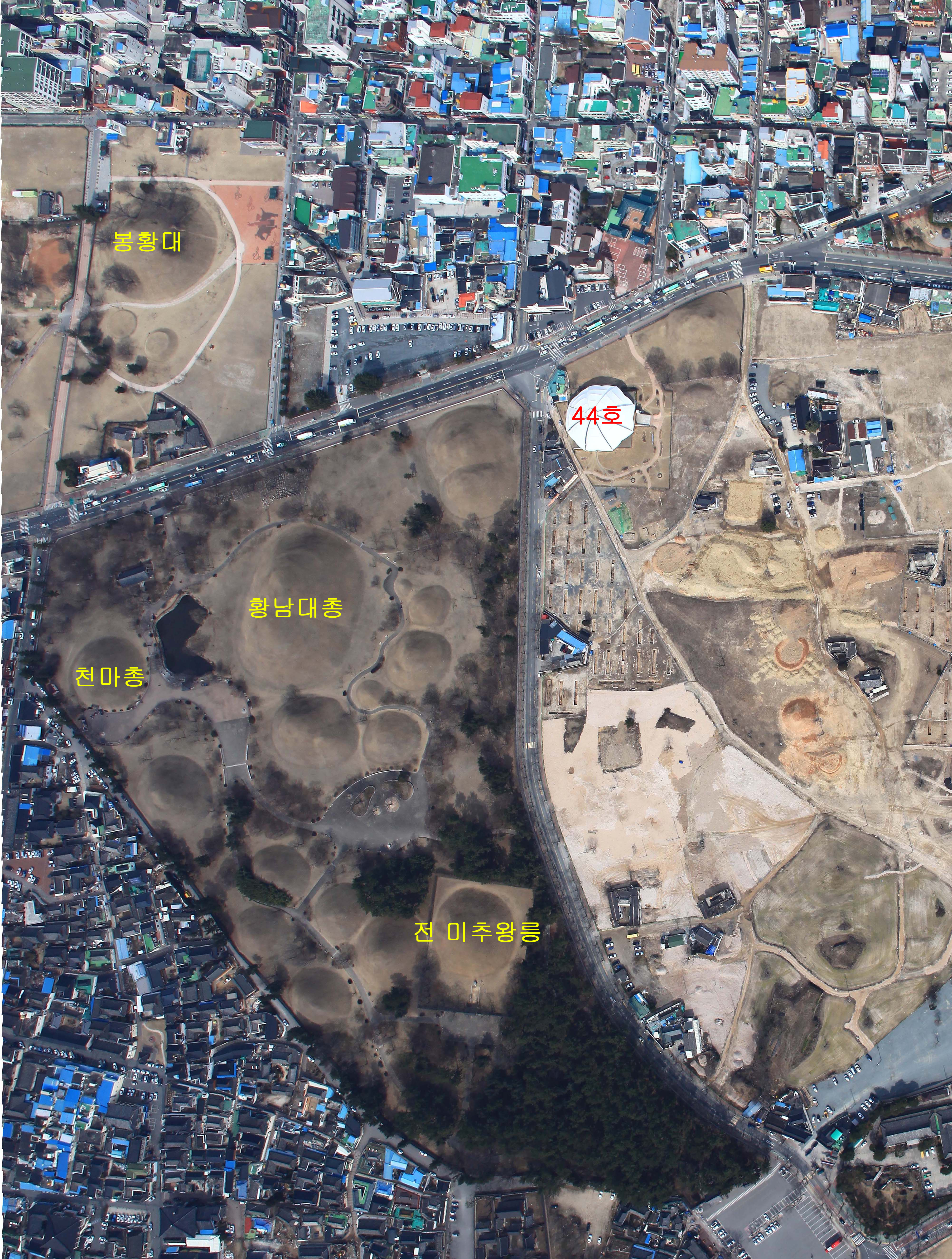44호 돌무지덧널무덤의 축조연대는 출토된 토기, 금귀걸이나 금팔찌의 형태로 보아 금관총 출토유물과 유사한 점으로 비추어 5세기 후반으로 추정된다.