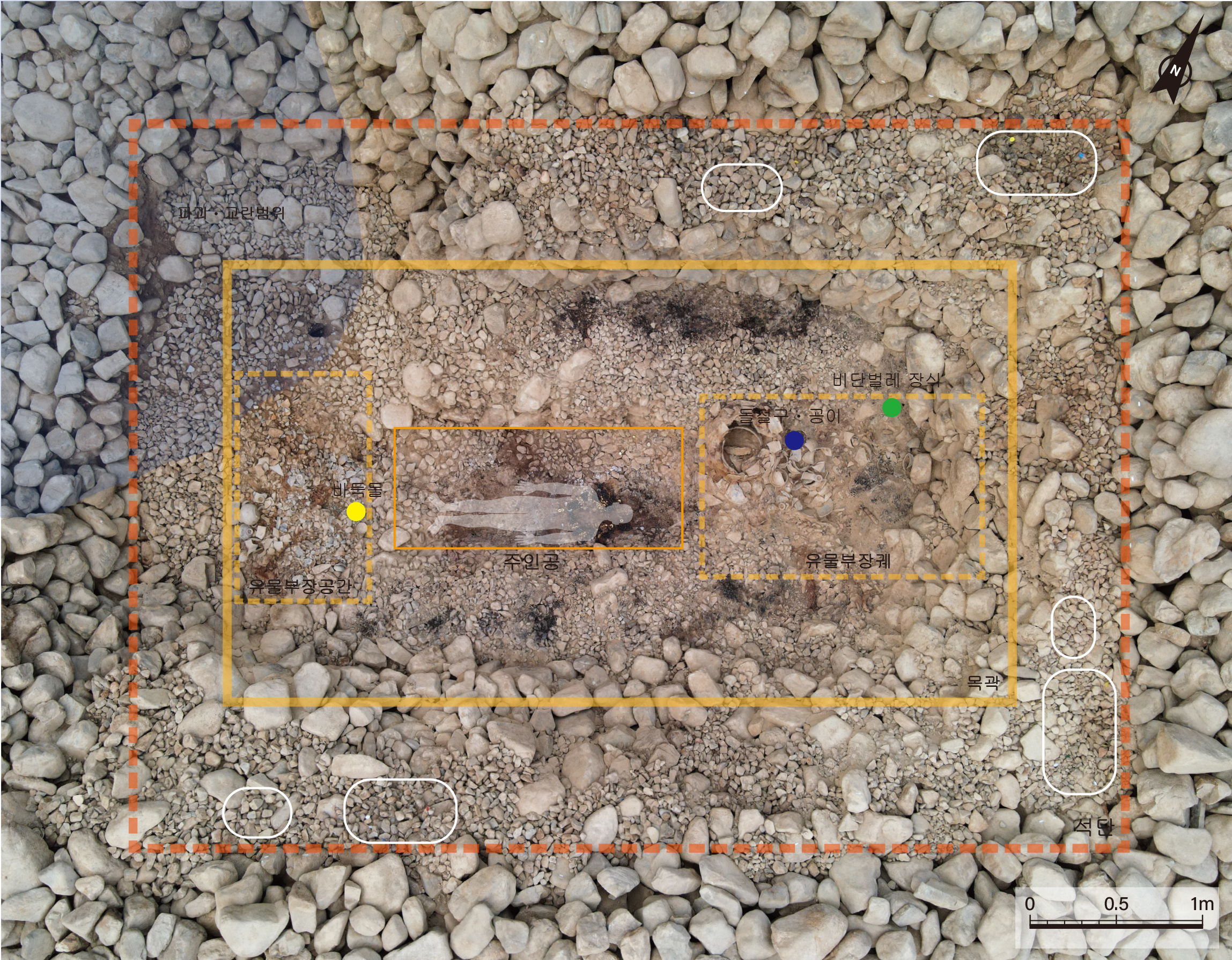 신라왕경추진단이 오늘 3일 공개한 경주 황남동 120-2호분 발굴성과 매장주체부 유물배치 양상이다. 허리춤 이상 얼굴까지 노출한 모습이어니와, 저 중에서도 금동관이 확인된 얼굴 부분만 확대