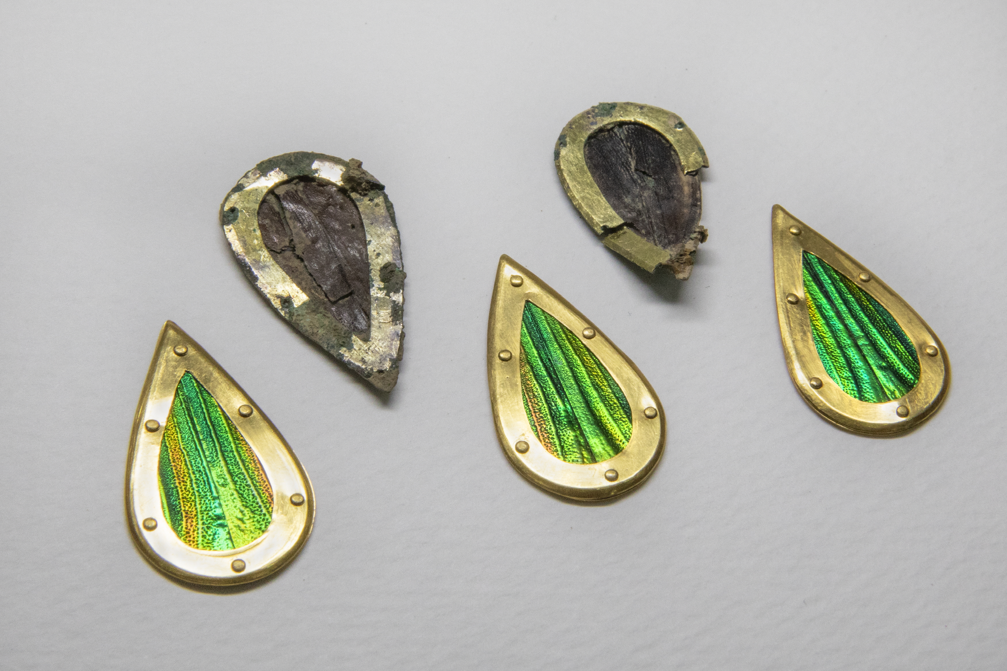 이번에 또 다른 주목할 만한 유물은 비단벌레 장식이다. 주인공 머리맡에 마련된 부장궤(副葬櫃, 부장품 상자) 상부에서 수십 점이 확인되었다. 비단벌레의 딱지날개 2매를 겹쳐 물방울 모양으로 만들고, 앞뒤판 둘레를 금동판으로 고정하여 만든 장식이다. 크기는 가로‧세로 1.6×3.0cm에 두께는 2㎜정도 소형이며, 신라 고분에서 지금까지 확인된 바가 없는 형태와 크기의 장식이다.