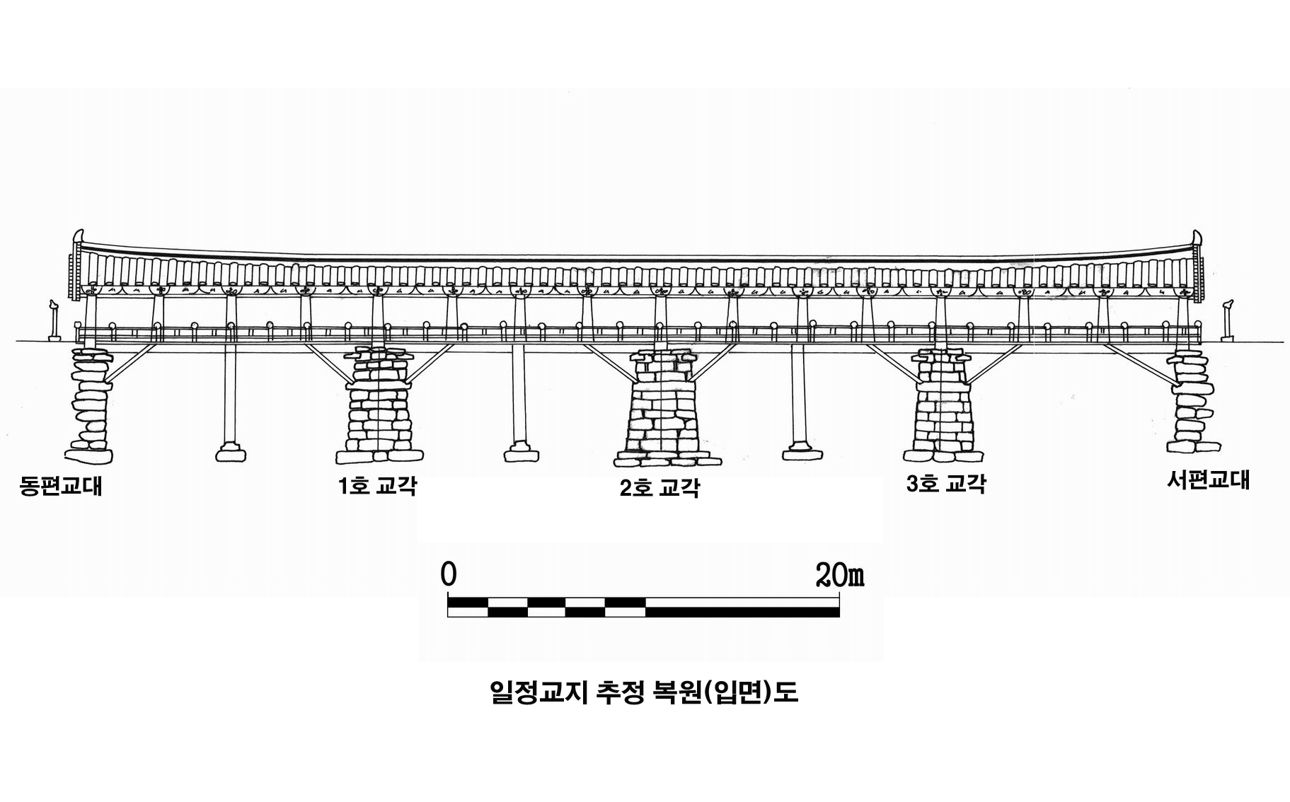 이 다리에는 모두 3개의 교각이 확인되었는데 유수 방향의 양단에 수압을 줄일 수 있도록 선수형(船首形)으로 만든 특징을 보여주고 있으며 그 규모는 각각 길이14.8×너비3.4m, 14.4×3.7m, 14.0×3.0m이다.