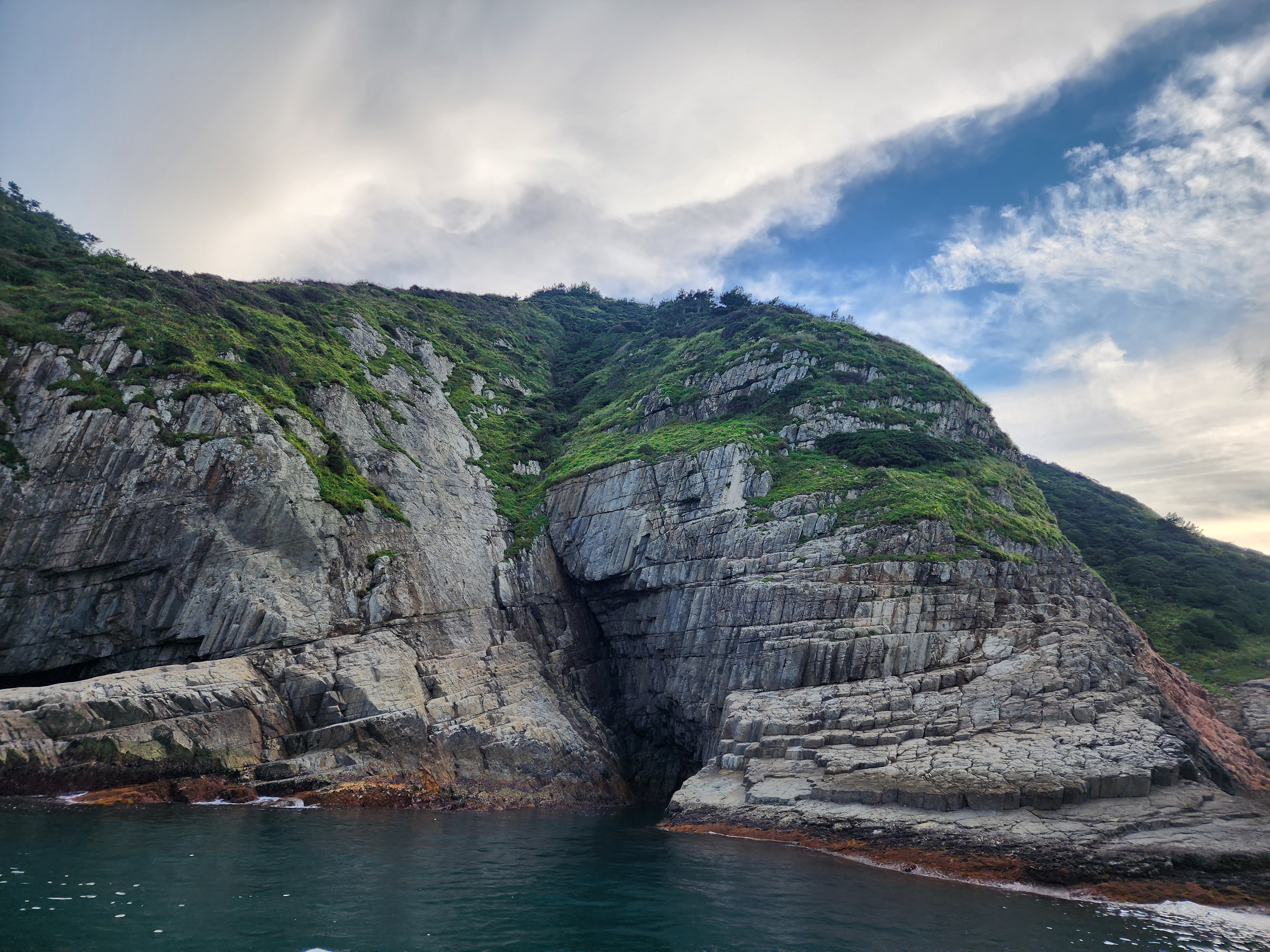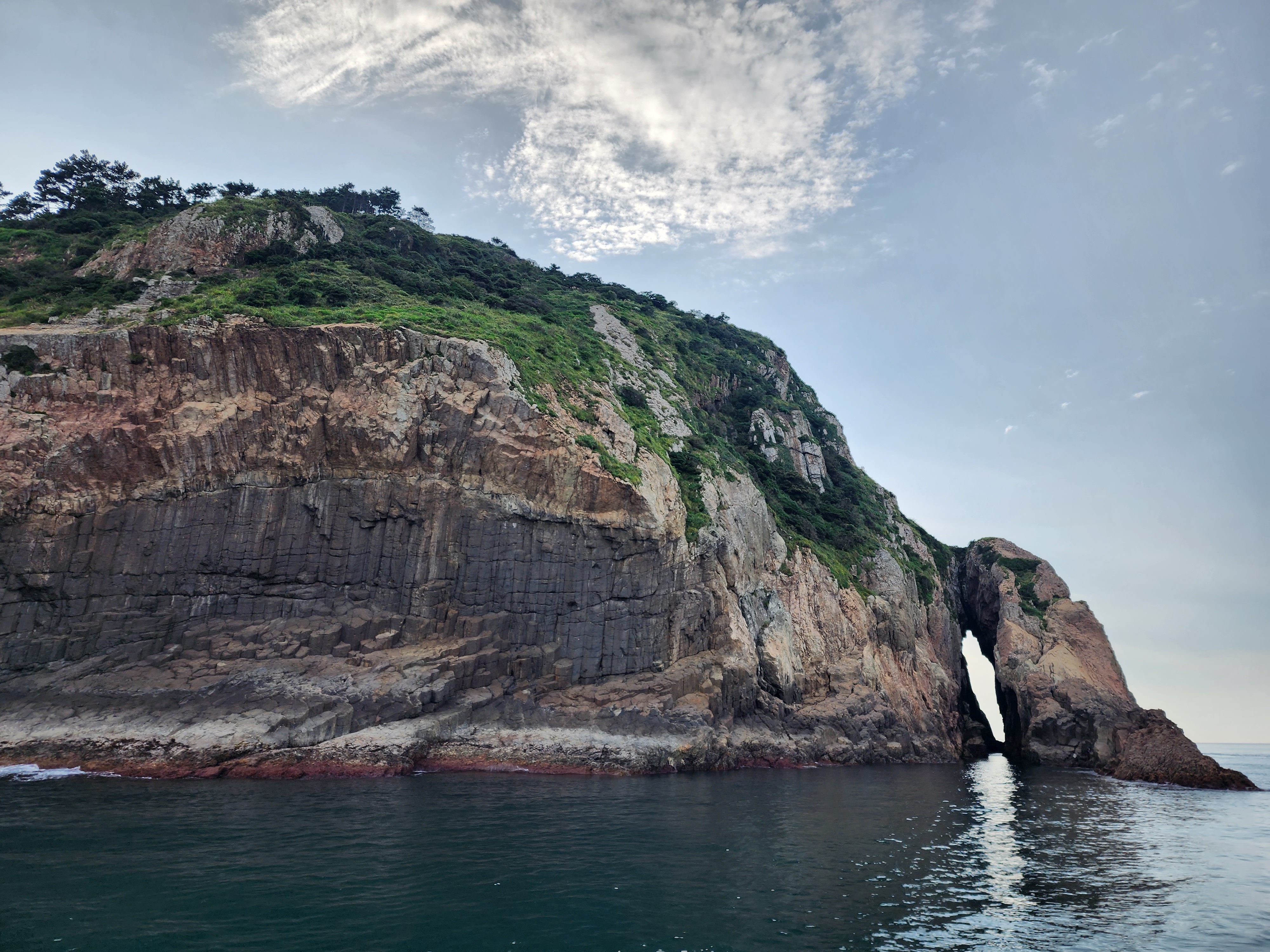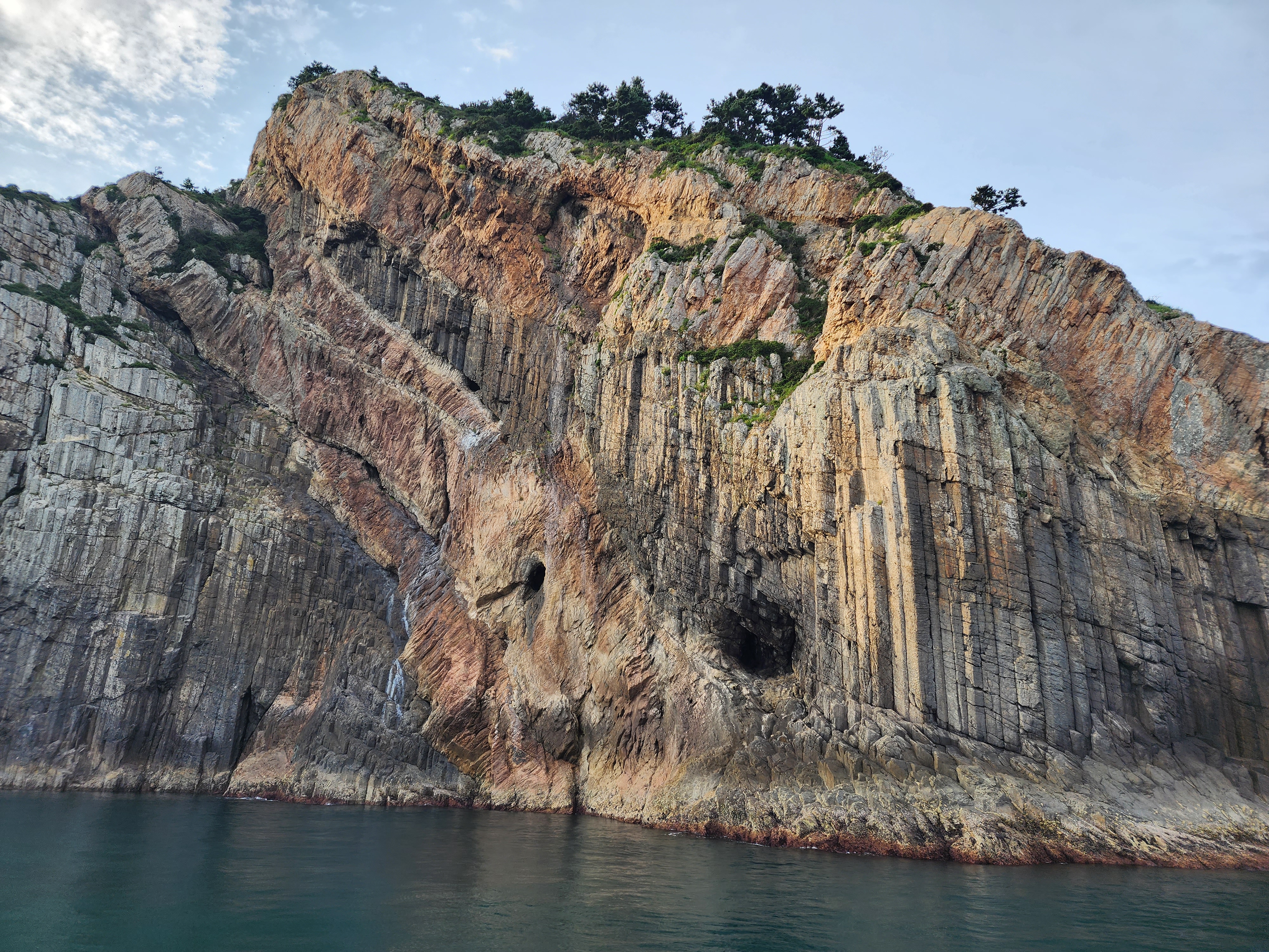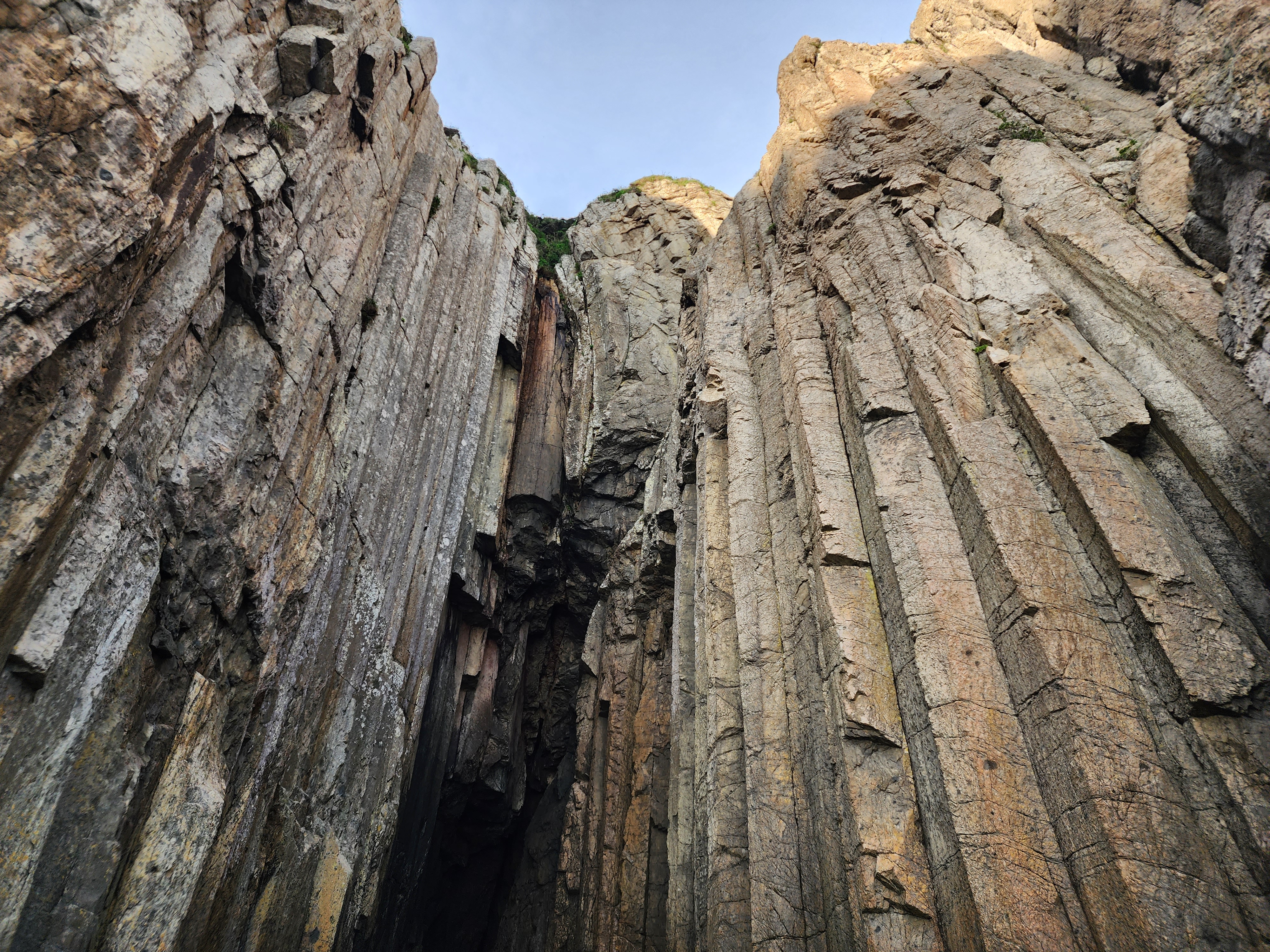 Manjaedo Island, where these columnar joints are located, is entirely composed of welded tuff created by volcanic activity during the Cretaceous period of the Mesozoic Era.