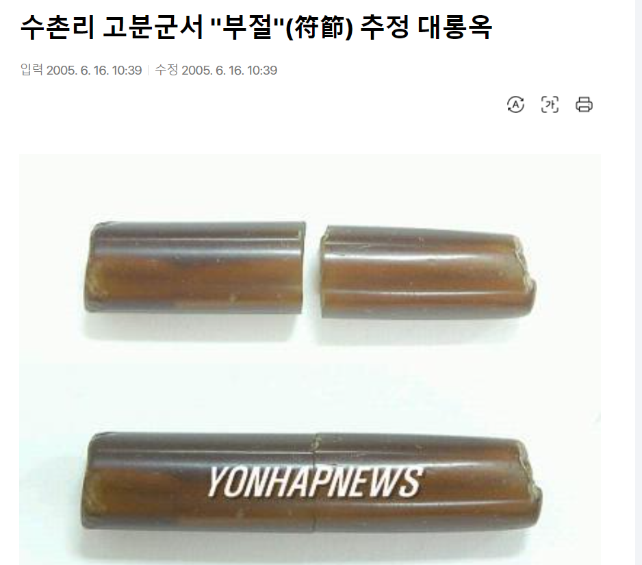 이번에 드러난 관옥이 부절임이 확실하다면, 이 수촌리 고분군이 축조되던 그 시점에 한성漢城(서울)에 중심을 둔 백제는 일종의 봉건제적 지방통치를 실시하고 있었음을 결정적으로 보여주는 확실한 증거가 될 수 있다.