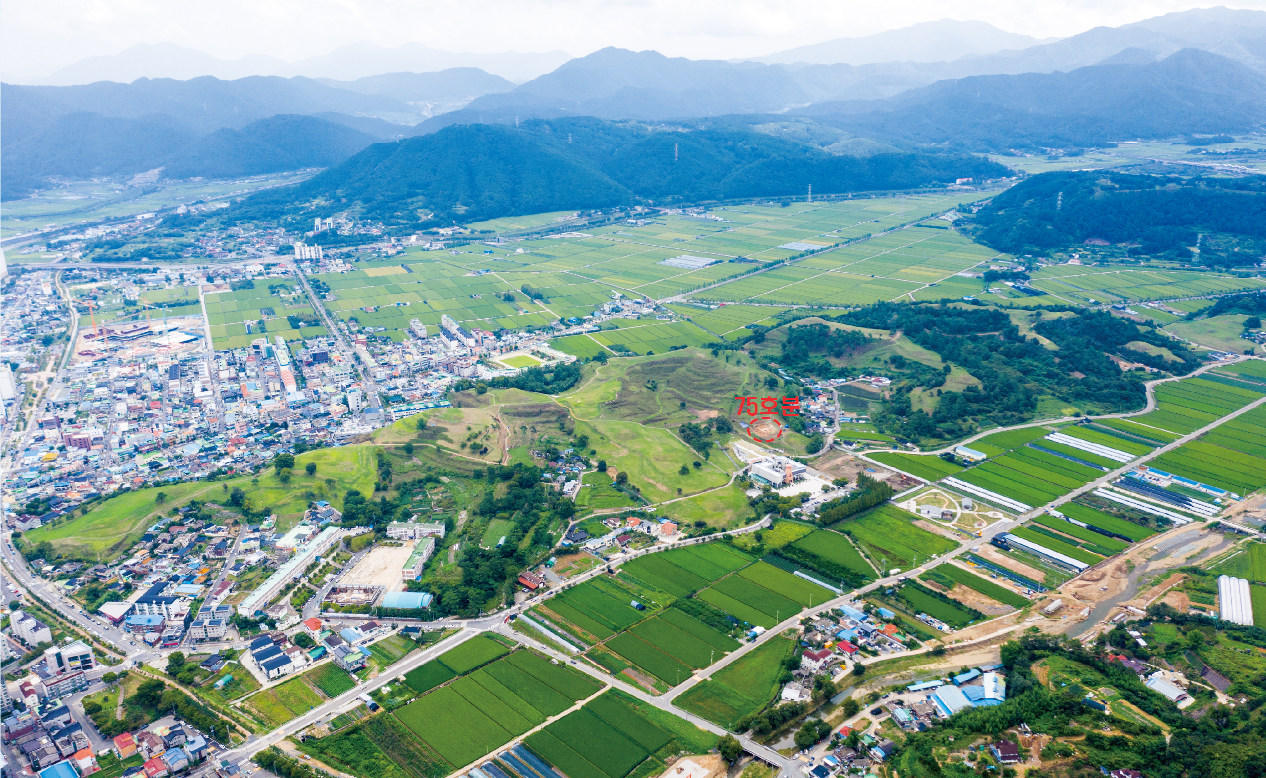 말이산고분군은 사방 산이 병풍으로 둘러친 함안분지 가운데 길게 뻗은 언덕배기를 따라 그 정상과 기슭에 무덤을 집중으로 조성한 공동묘지라, 이번에 조사한 75호분은 그 중간 기슭에 자리한다.