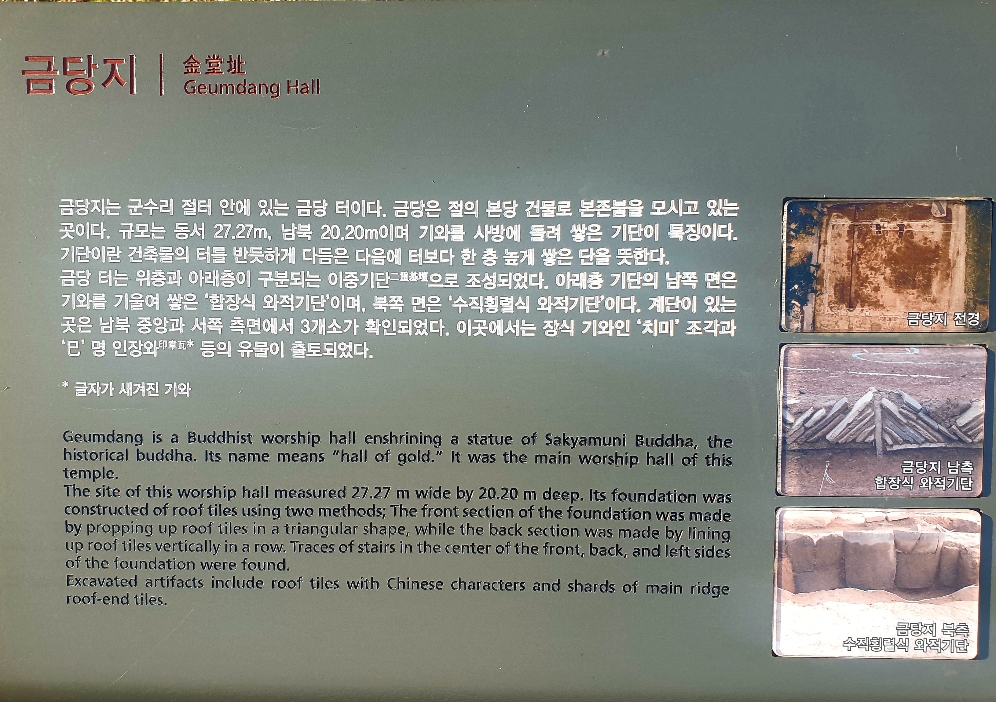 The foundations of the lecture hall and main worship hall were made of roof tiles, which was a common Baekje architectural feature not found in other Korean kingdoms.